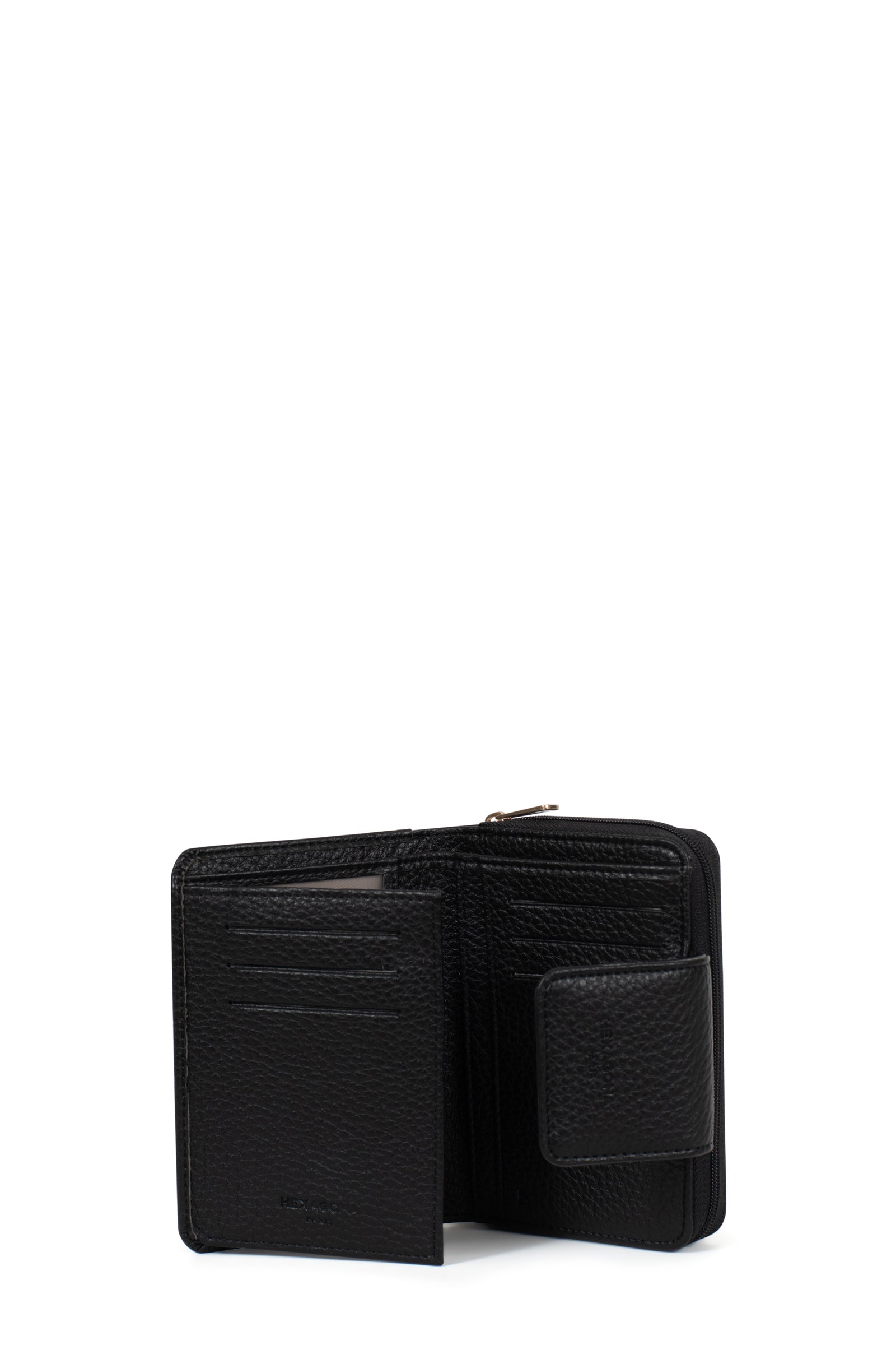 - Intérieur : 2 volets. 1 compartiment principal. 1 porte-monnaie zippé. 6 poches plates (dont 2 à vue transparente). 6 emplacements carte. 1 poche billets.