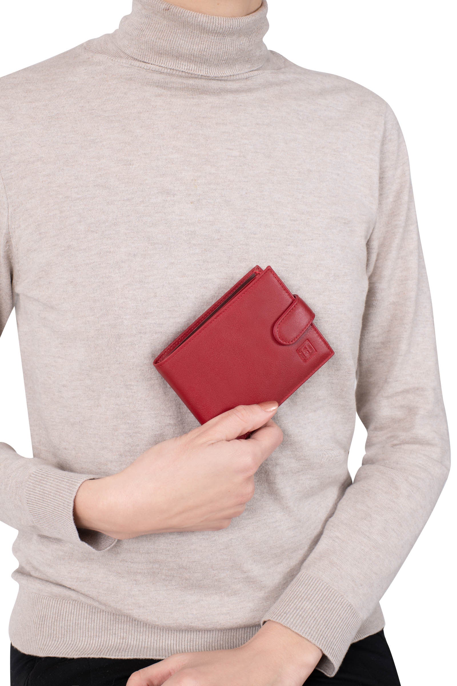 Erhältlich in mehreren Farben, darunter ein leuchtendes Rot, ein klassisches Schwarz und ein marineblau, bringt jeder Farbton eine einzigartige Note mit sich, sodass Sie diejenige auswählen können, die am besten zu Ihrem persönlichen Stil passt. Sein Design mit zwei Falten ermöglicht ein einfaches Öffnen und einen schnellen Zugriff auf Ihre Karten und Geldscheine.
