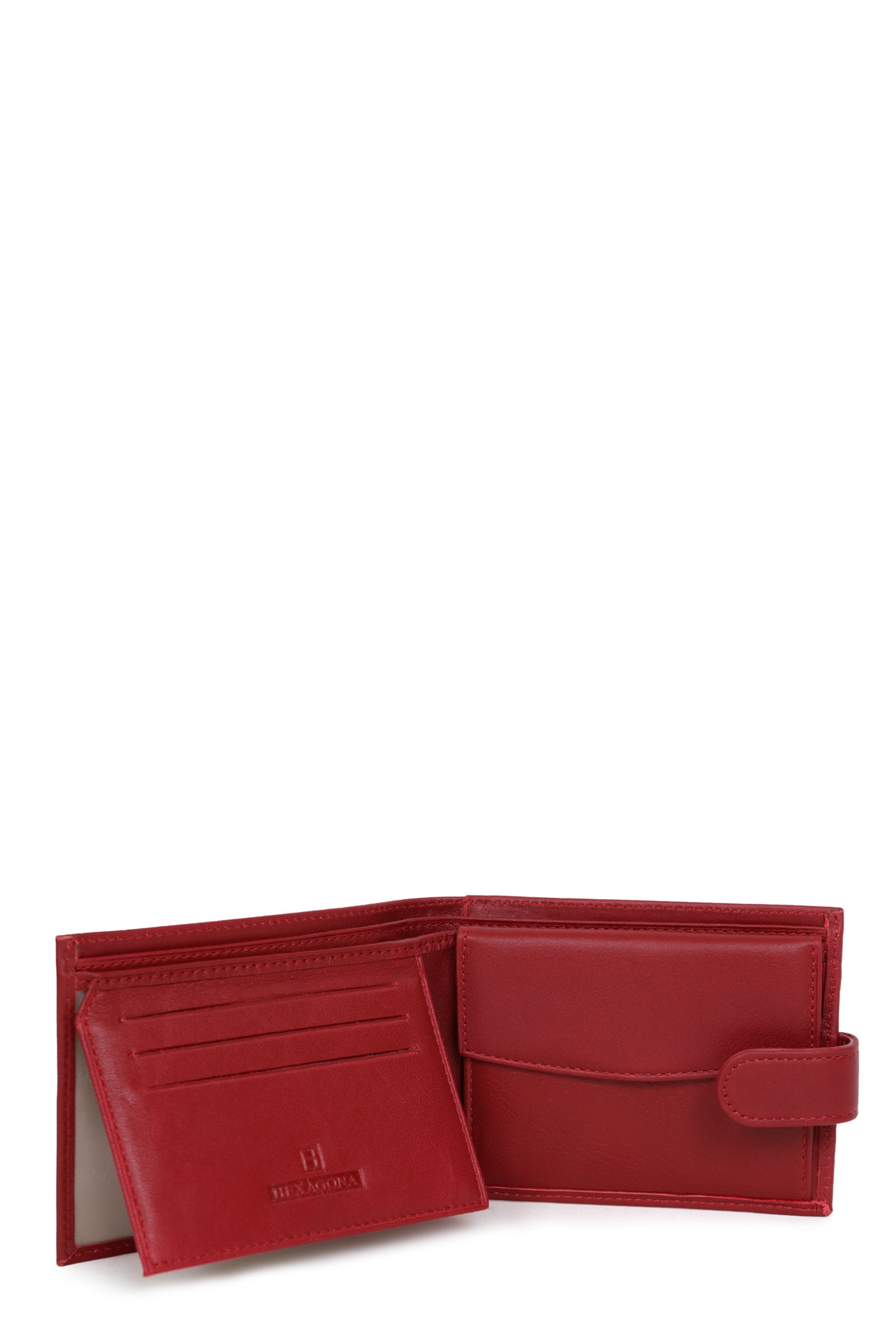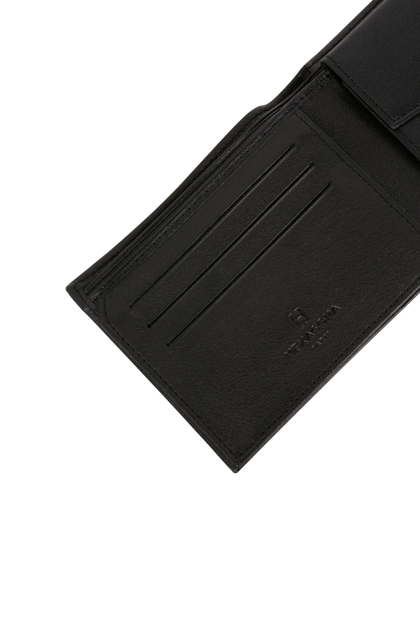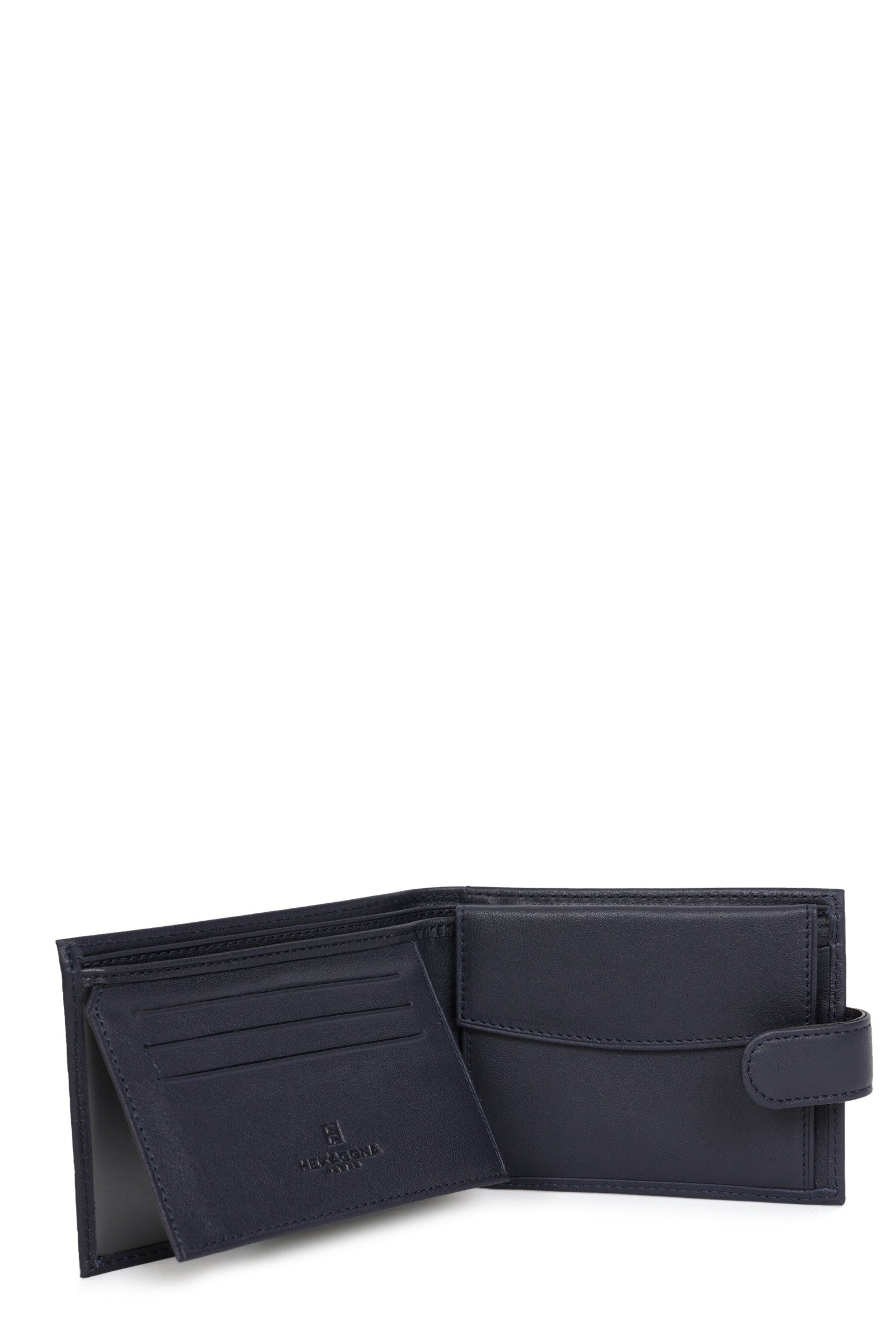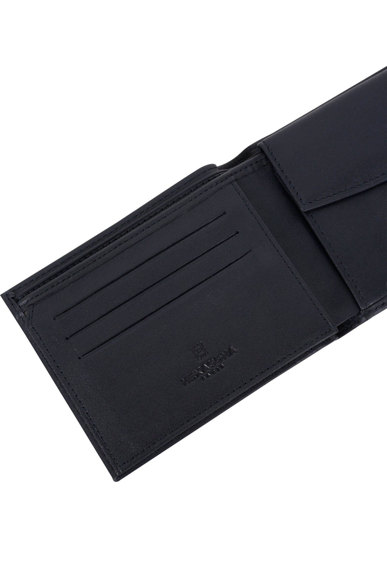 - Innen : 2 Fächer. 1 Druckknopf-Münzfach. 3 flache Taschen (davon 2 mit durchsichtigem Sichtfenster). 3 Kartenfächer. 2 Geldscheinfächer.