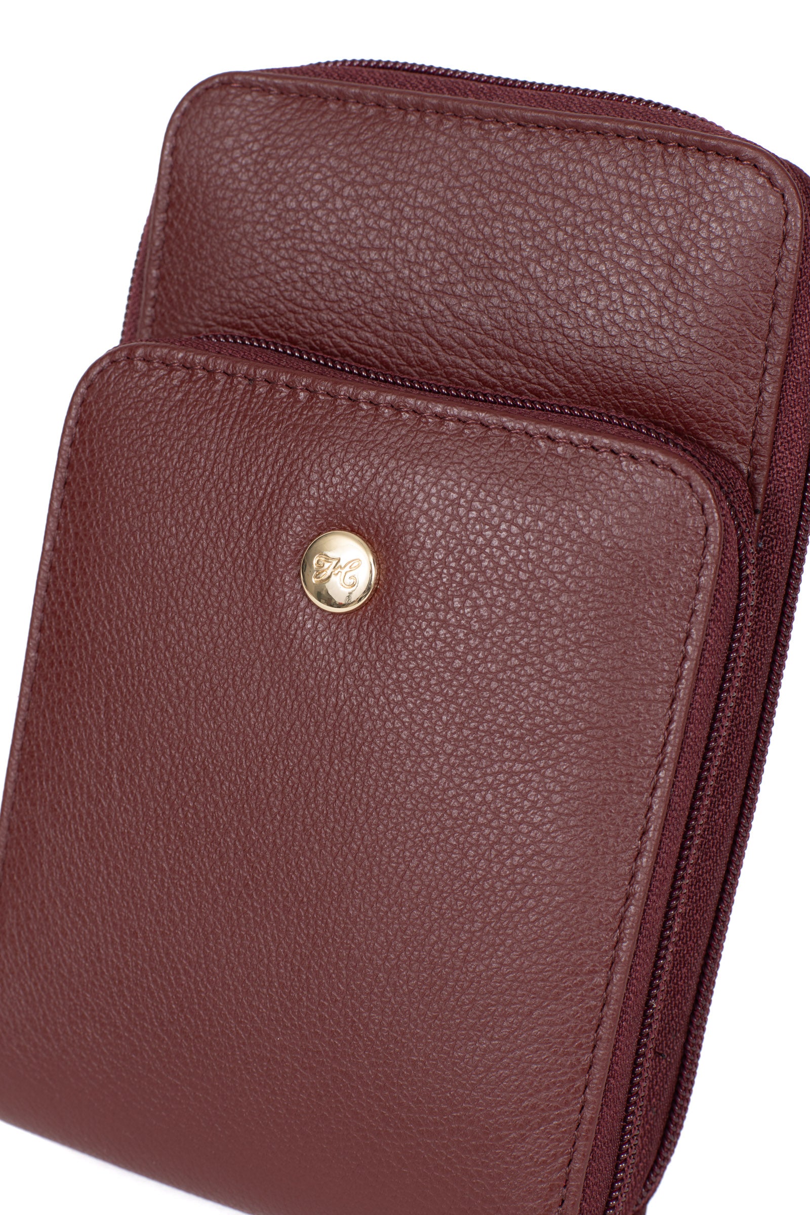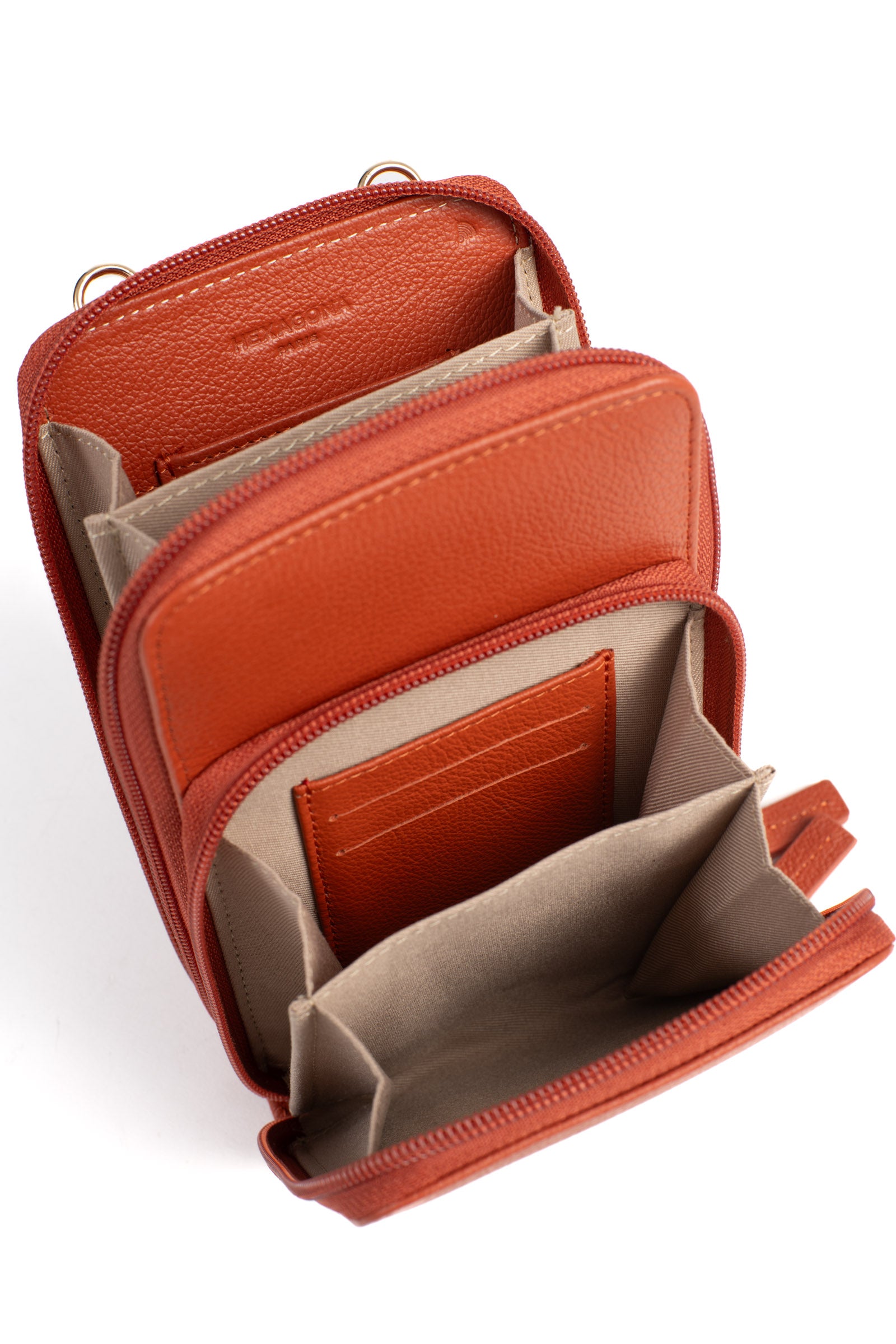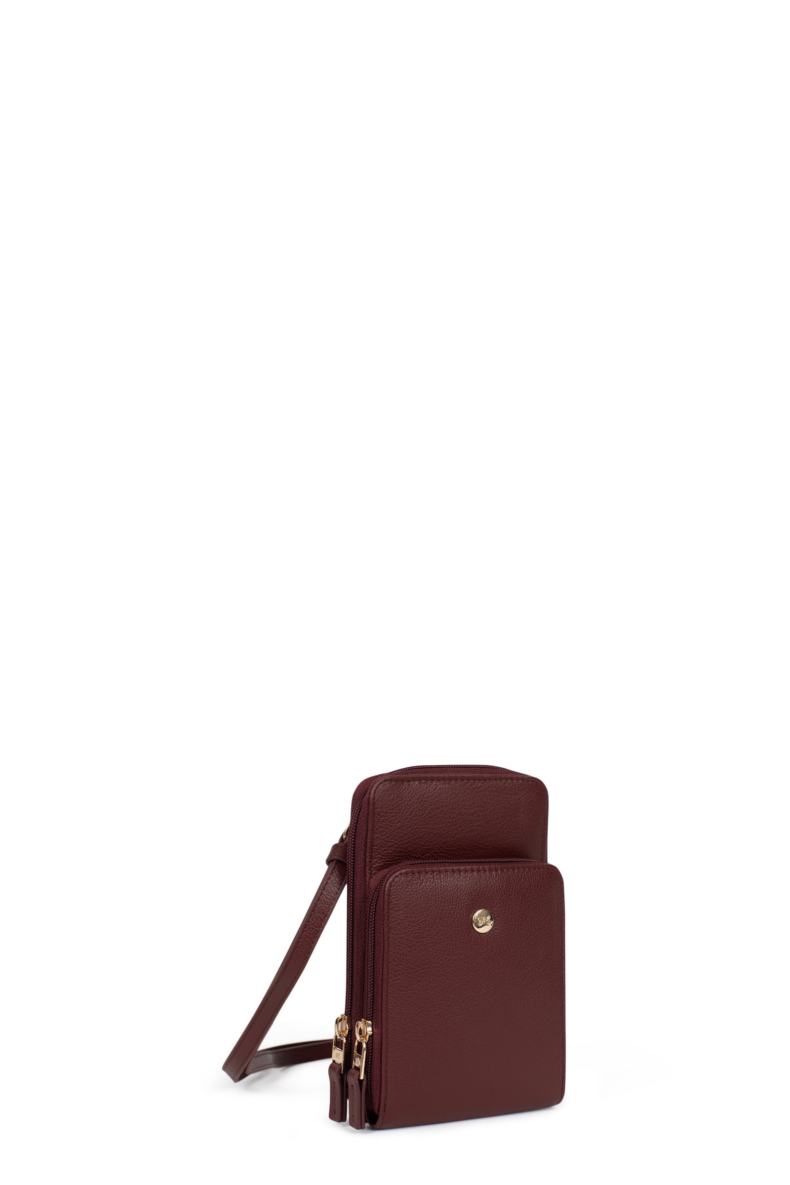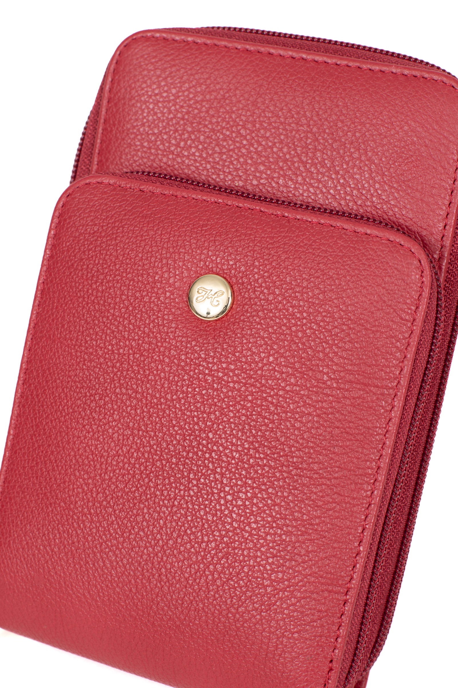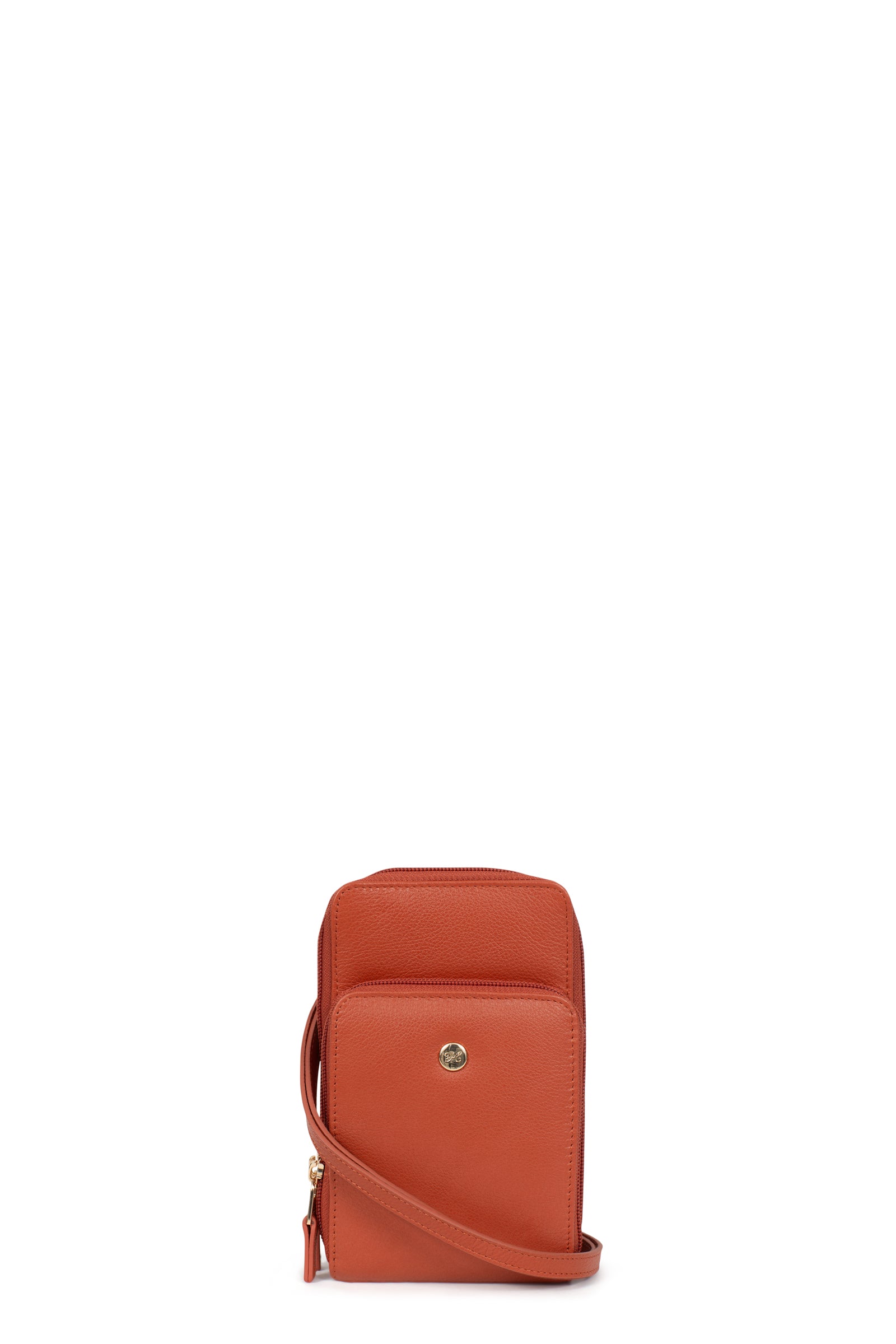 Diese Handytasche vereint Eleganz und Praktikabilität, entworfen zum Schutz Ihrer Karten und Ihres Handys, während sie Ihrem Look eine raffinierte Note verleiht. Hergestellt aus geprägtem Rindsleder, ist sie in mehreren Farben erhältlich, darunter schwarz, gold, orange, pflaume, dunkelrot, silber, Tannengrün und keksfarben.