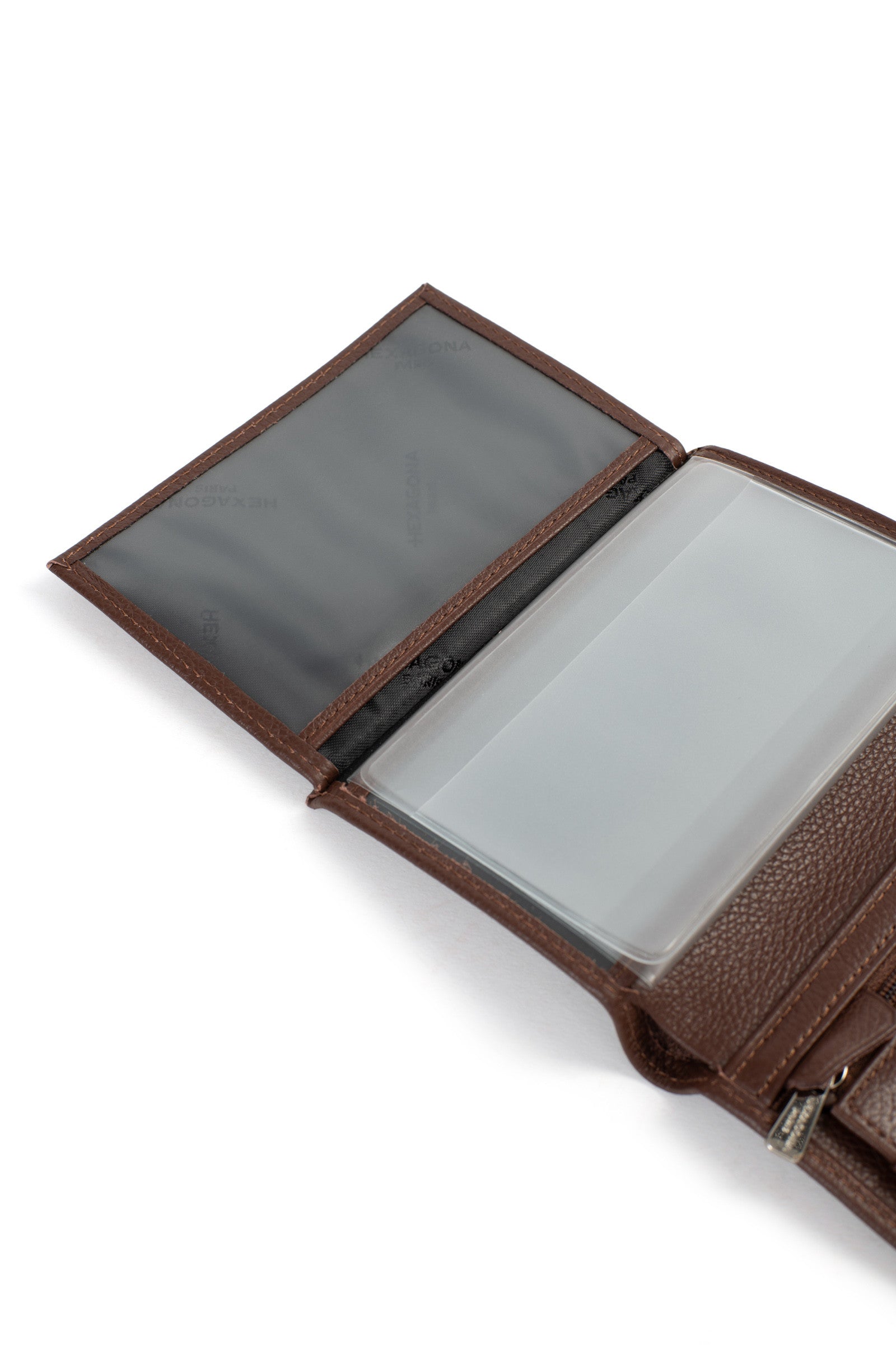 Innen: 2 Fächer. 1 Reißverschluss-Münzfach. 4 flache Taschen (davon 2 mit Sichtfenster). 4 Kartenfächer. 1 Geldscheinfach.