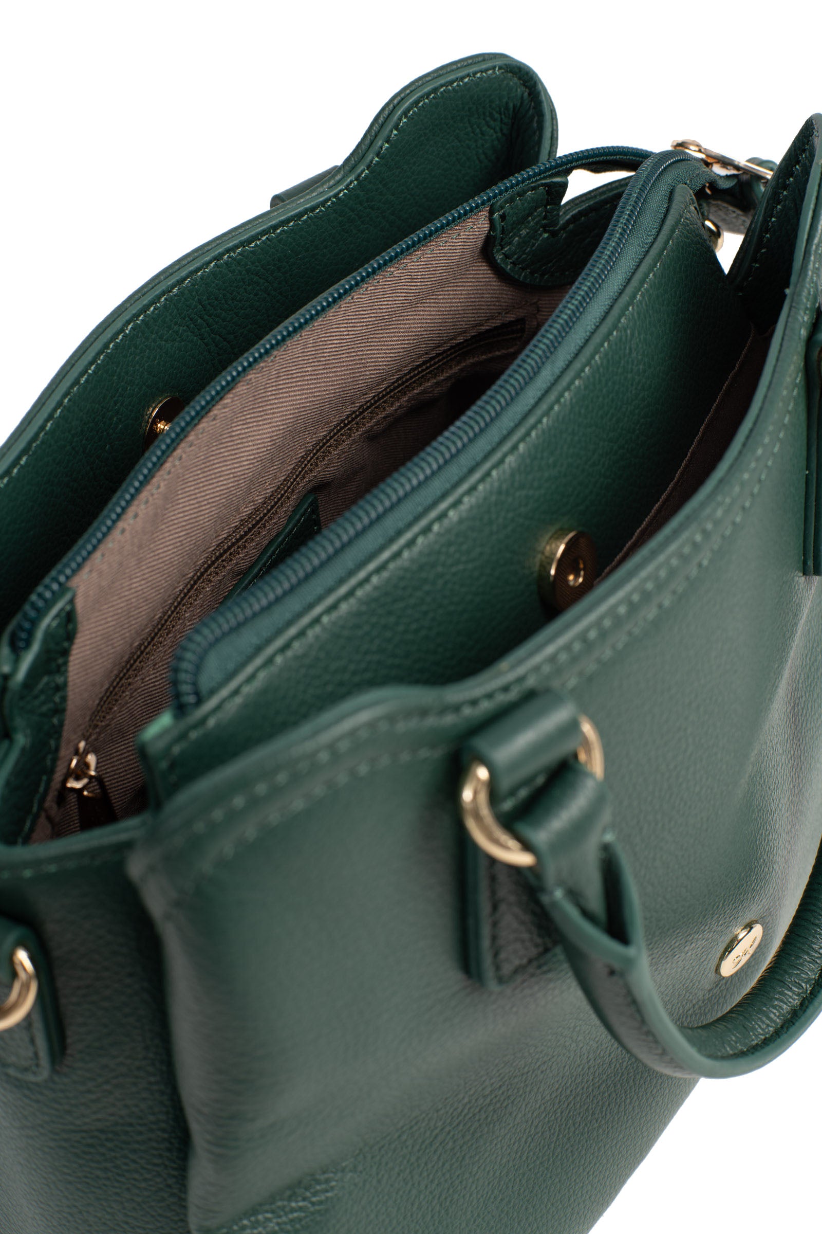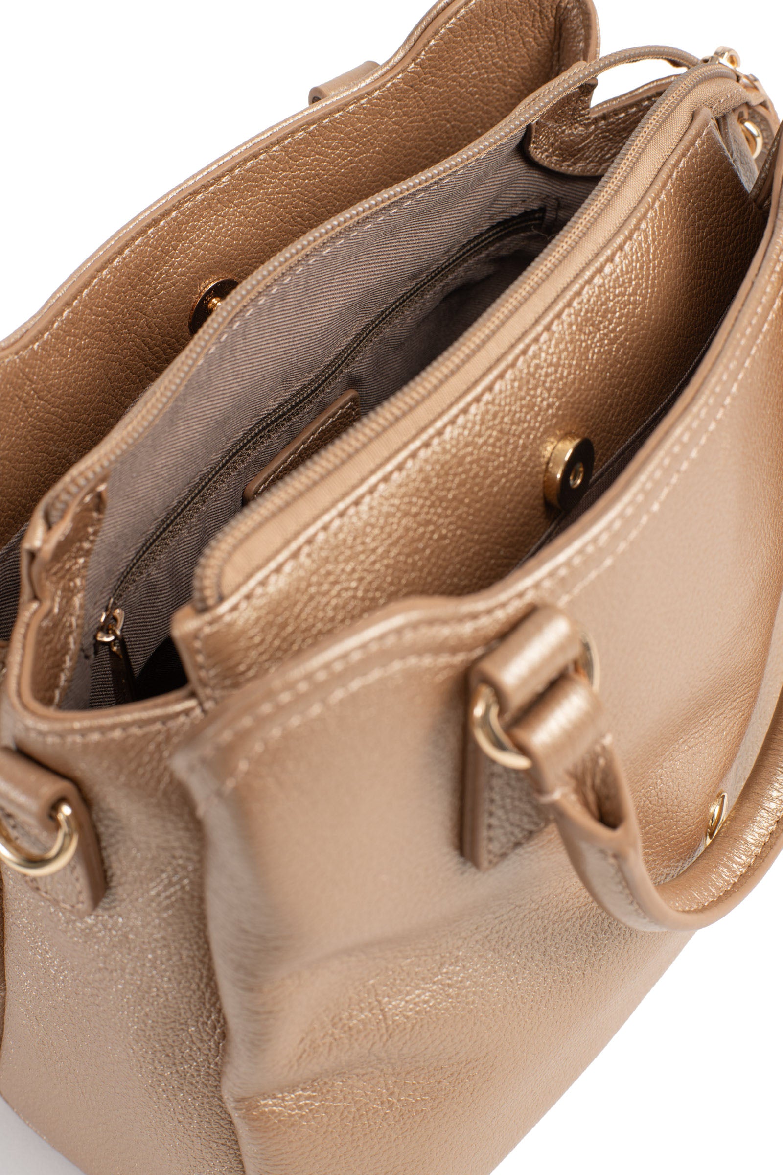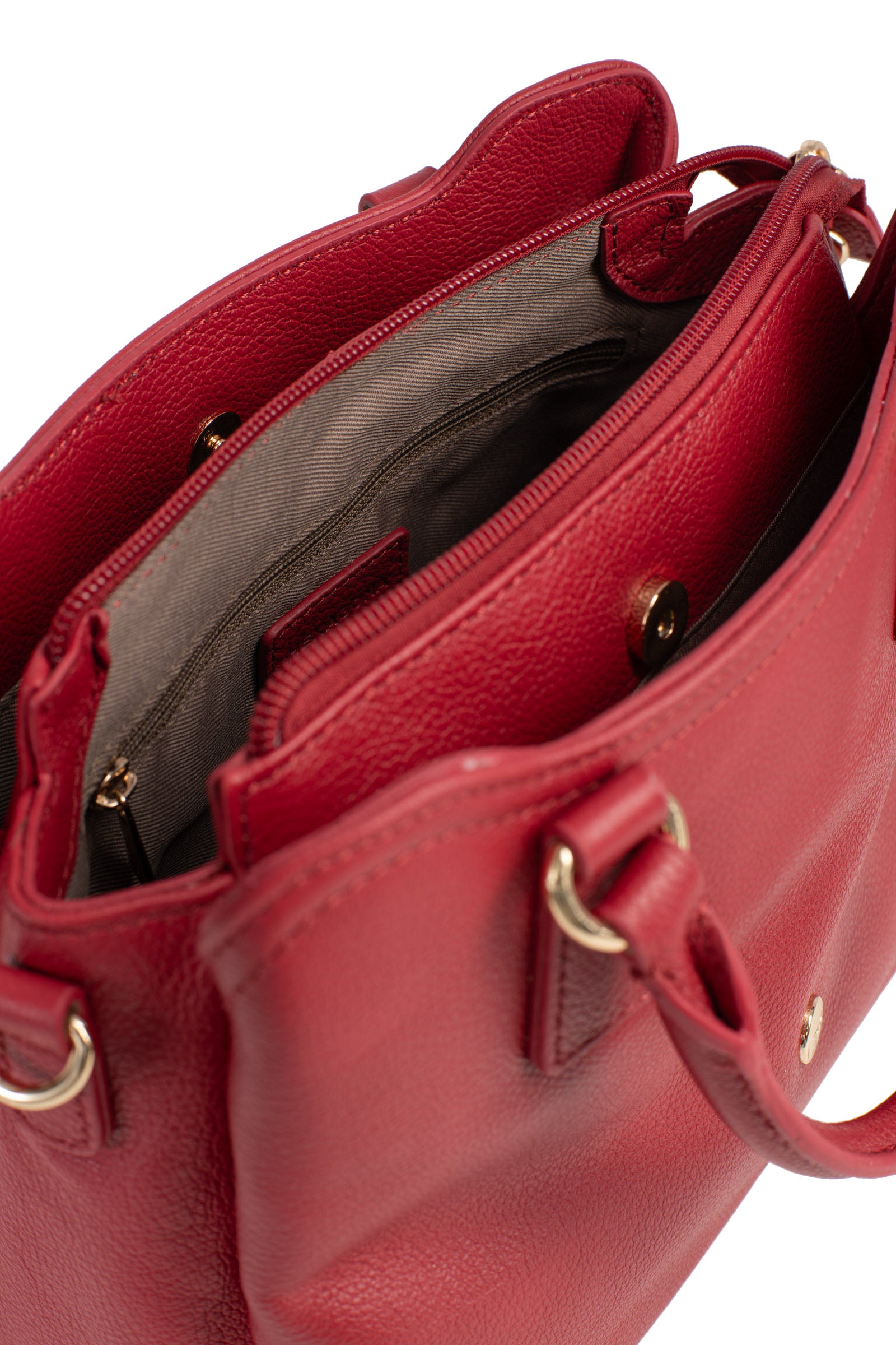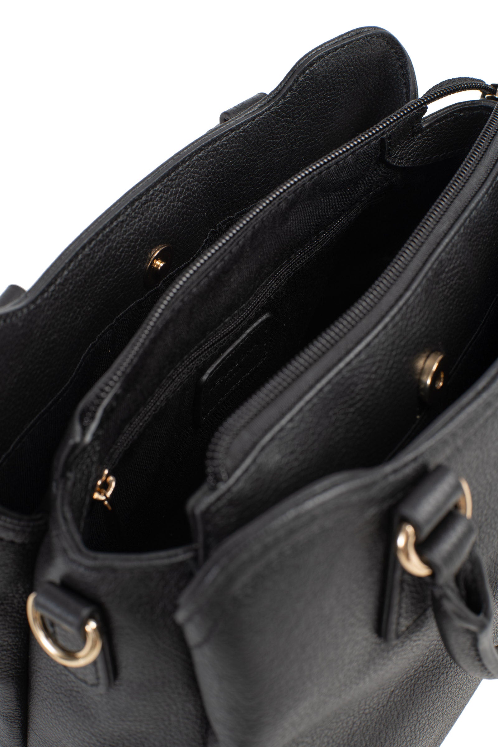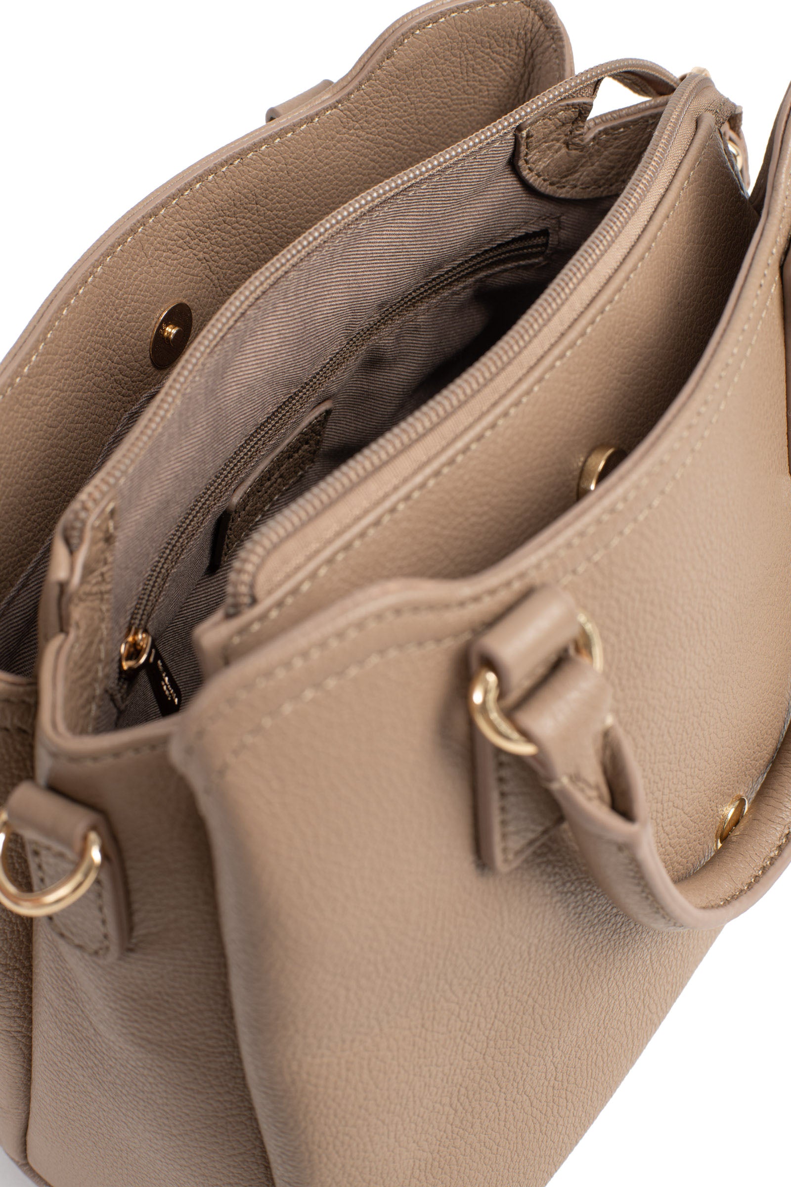 Innen: 3 Hauptfächer mit 1 flacher, mit Reißverschluss versehenen Tasche. 1 Telefonfach.