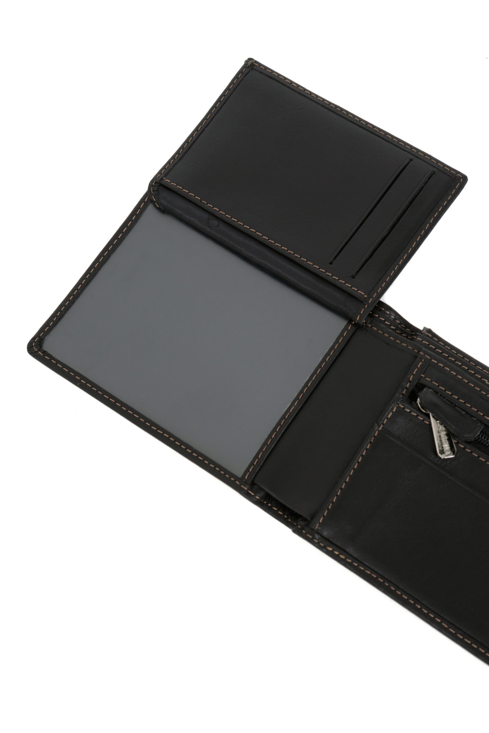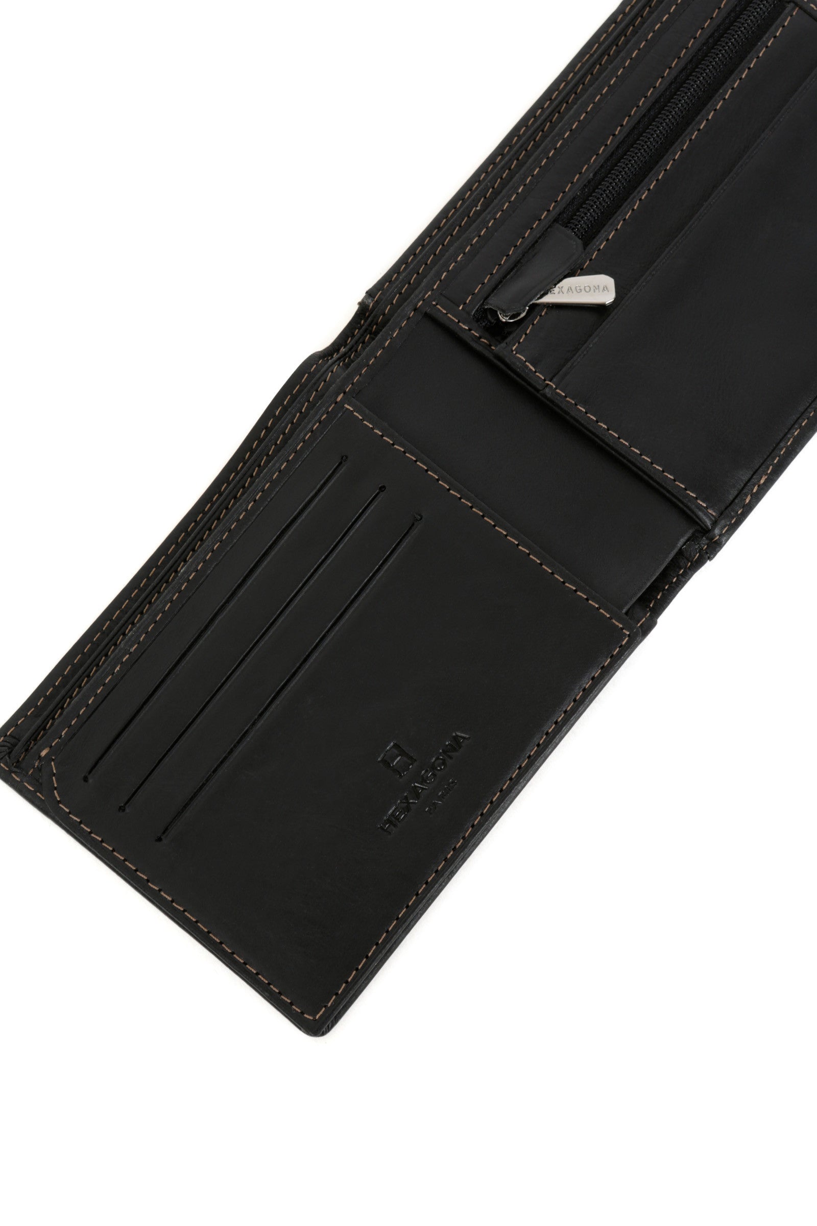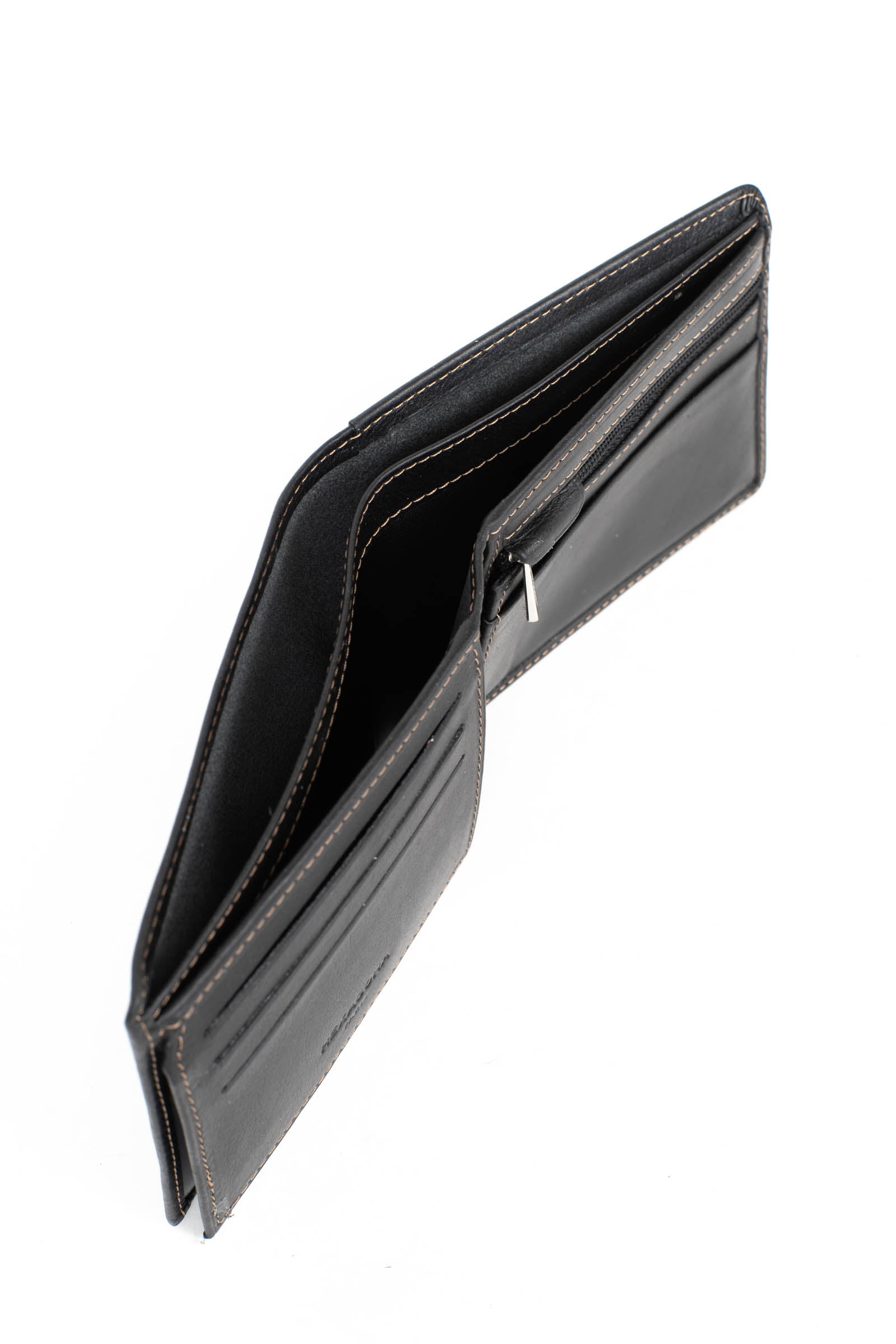 Innen: 2 Fächer. 1 Reißverschluss-Münzfach. 5 flache Taschen (davon 1 mit durchsichtigem Sichtfenster). 5 Kartenfächer. 2 Geldscheinfächer.