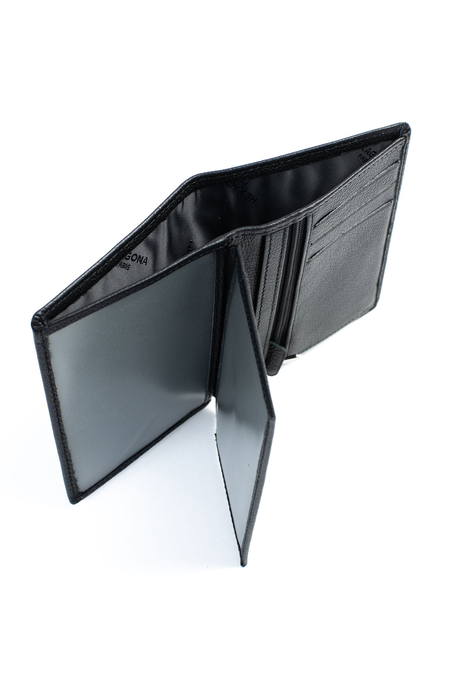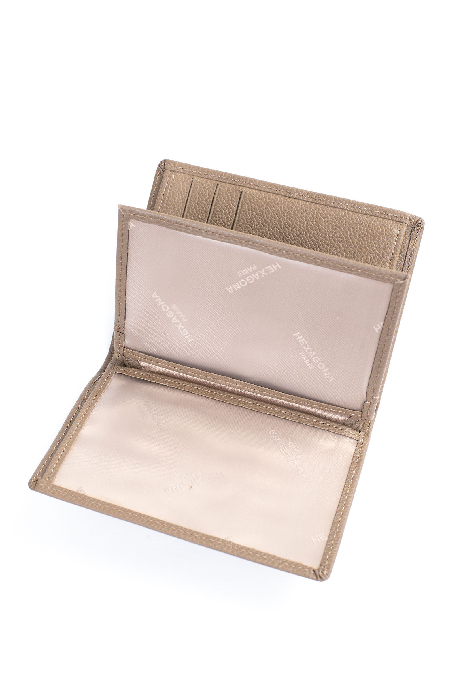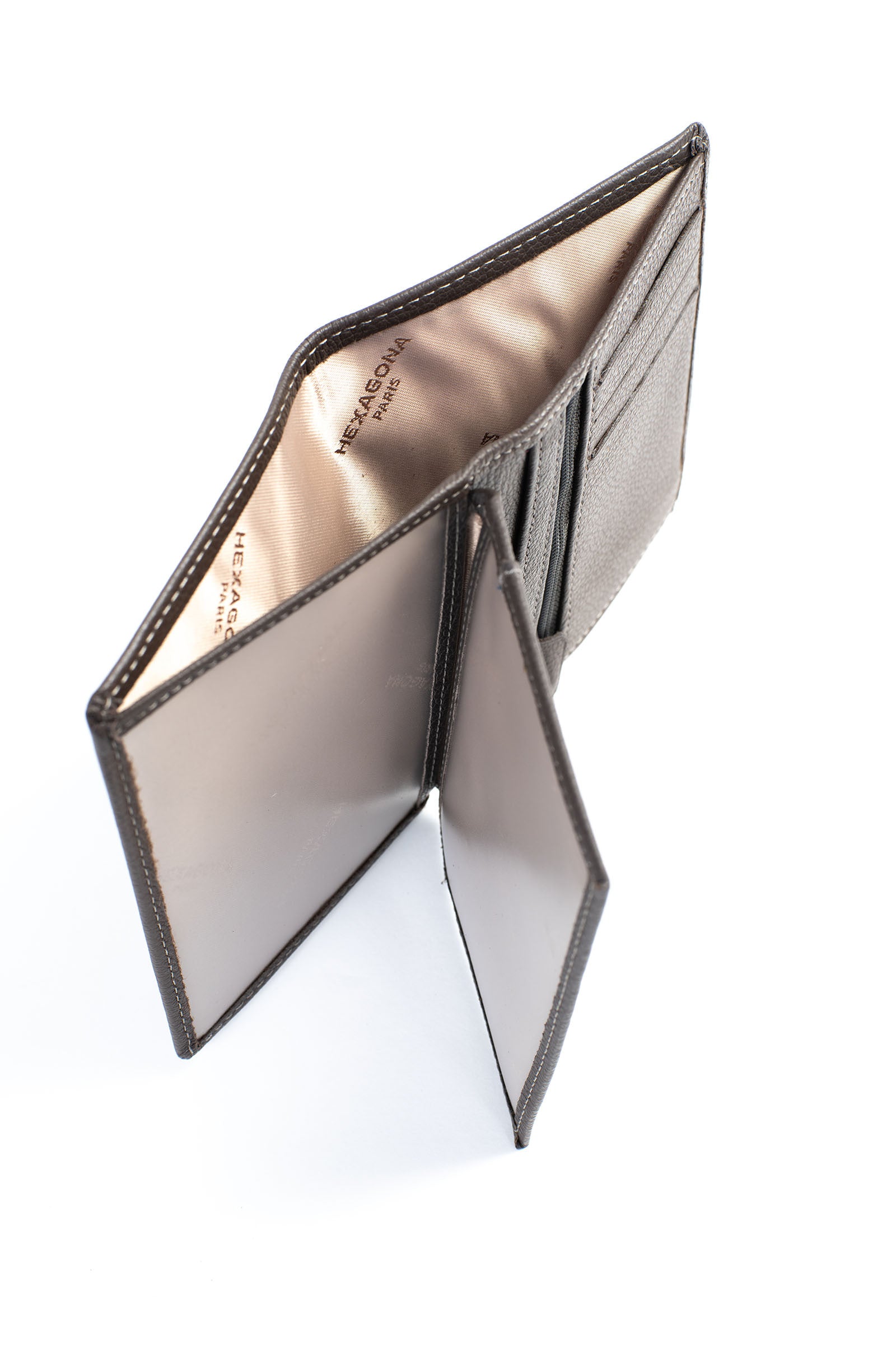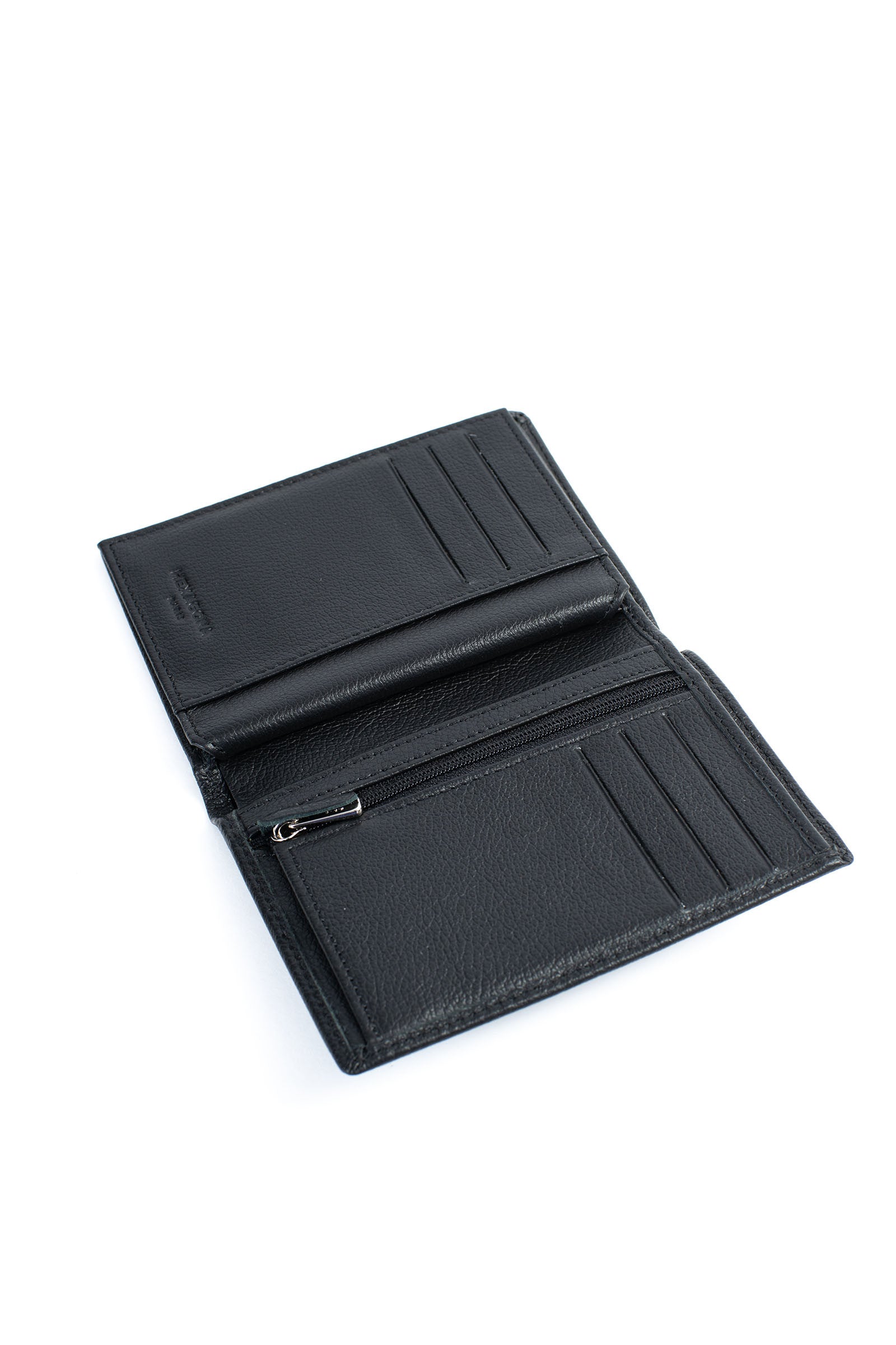 Innen: 2 Fächer. 1 Reißverschluss-Geldbörse. 5 flache Taschen (davon 2 mit durchsichtigem Sichtfenster). 6 Kartenfächer. 1 Geldscheintasche. 1 abnehmbares Kunststoffetui.