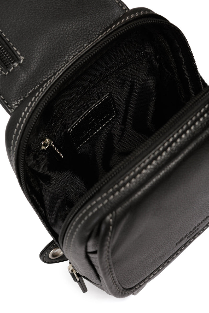 Außen: 2 Vorderfächer (1 mit Magnetklappe und 1 flach mit Reißverschluss). 1 flaches Rückfach mit Reißverschluss.