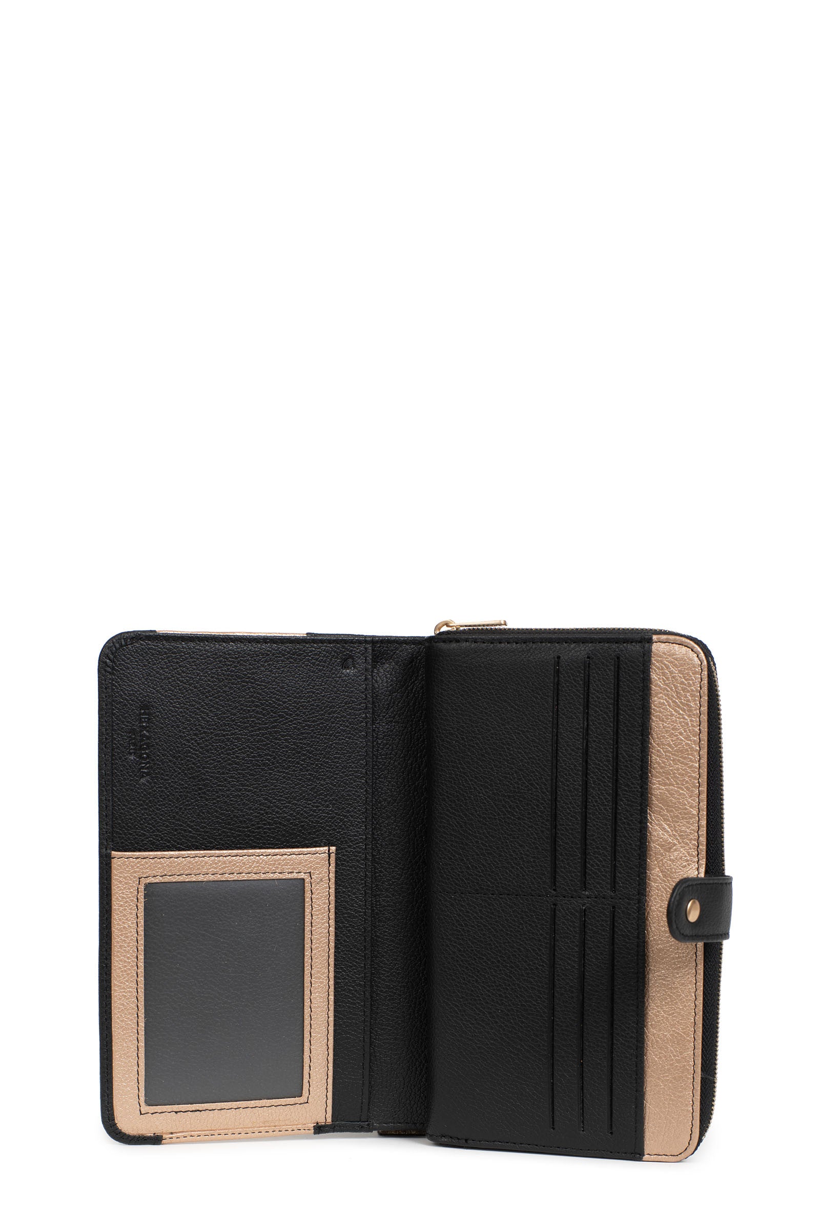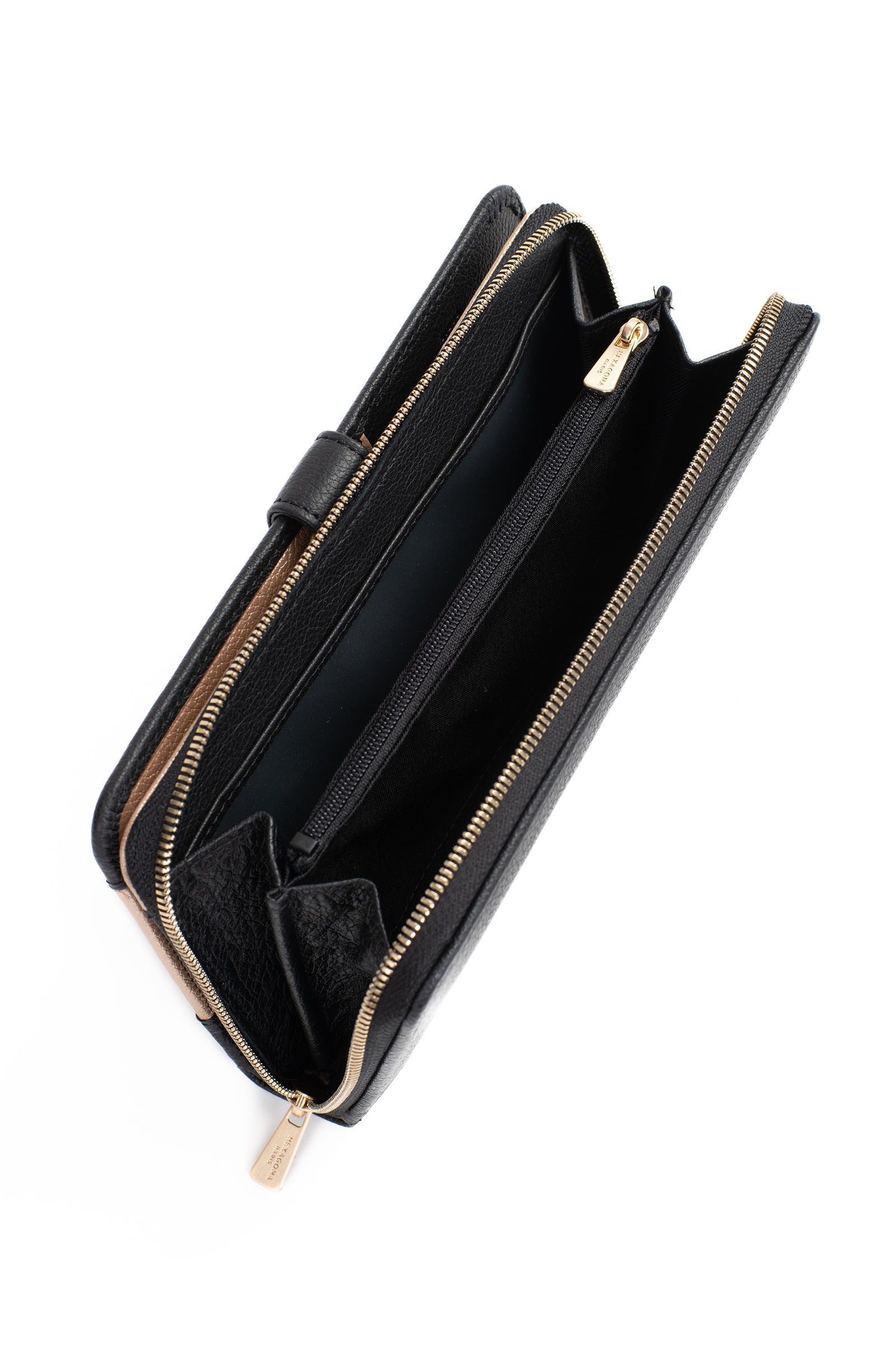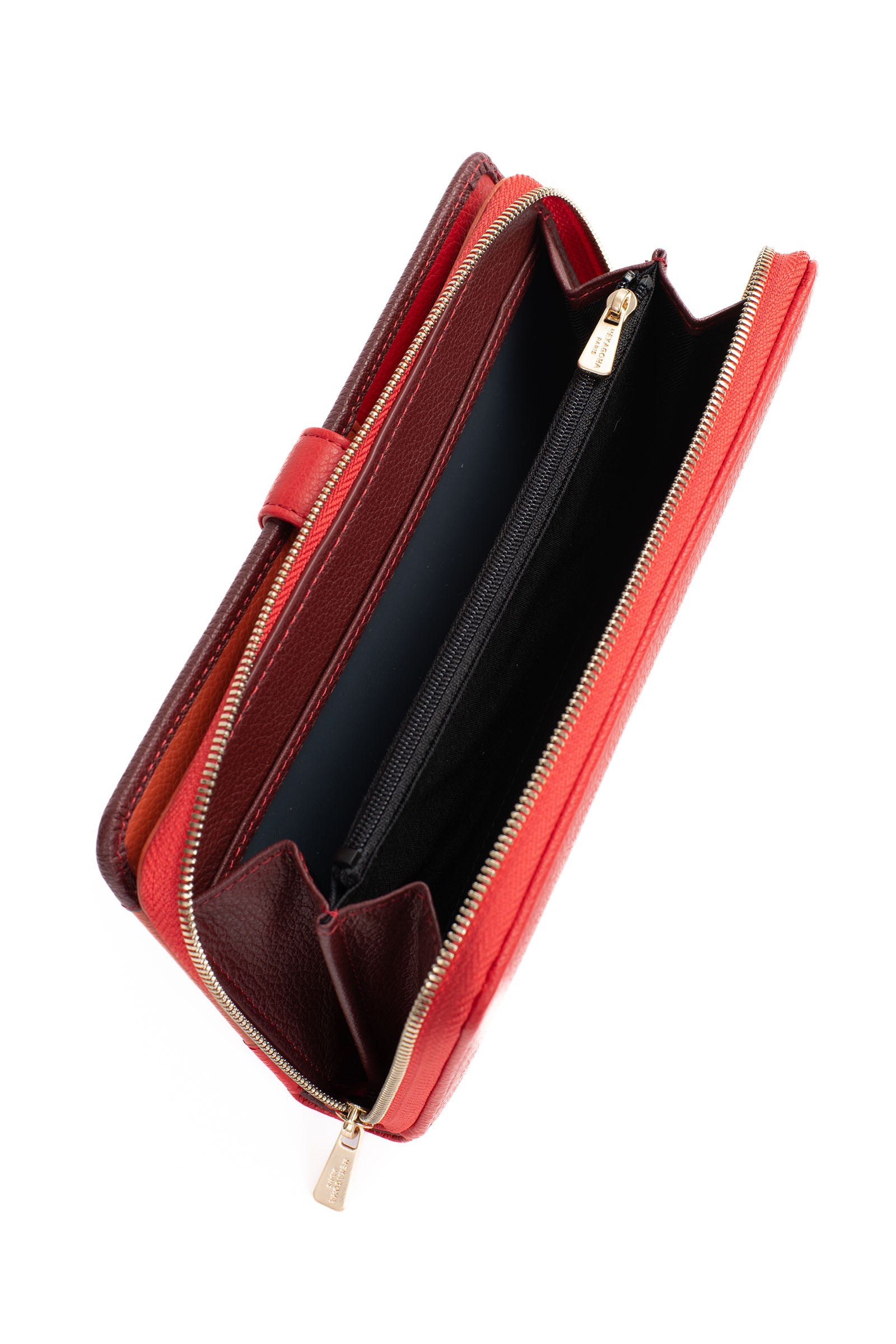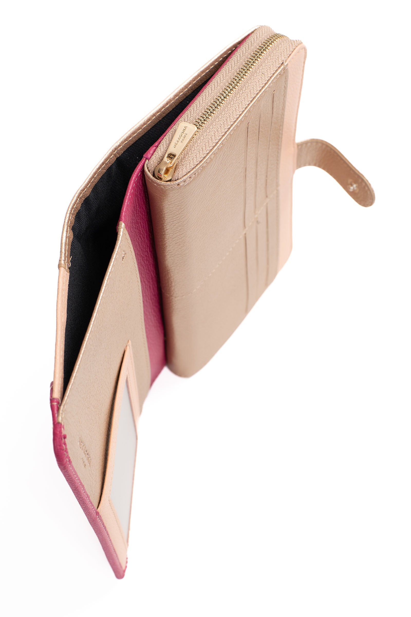 Innen: 1 Klappe. 1 Hauptfach. 1 Reißverschluss-Münzfach. 6 flache Taschen (davon 2 mit Sichtfenster). 12 Kartenfächer. 1 Geldscheinfach. 1 Scheckheftfach.