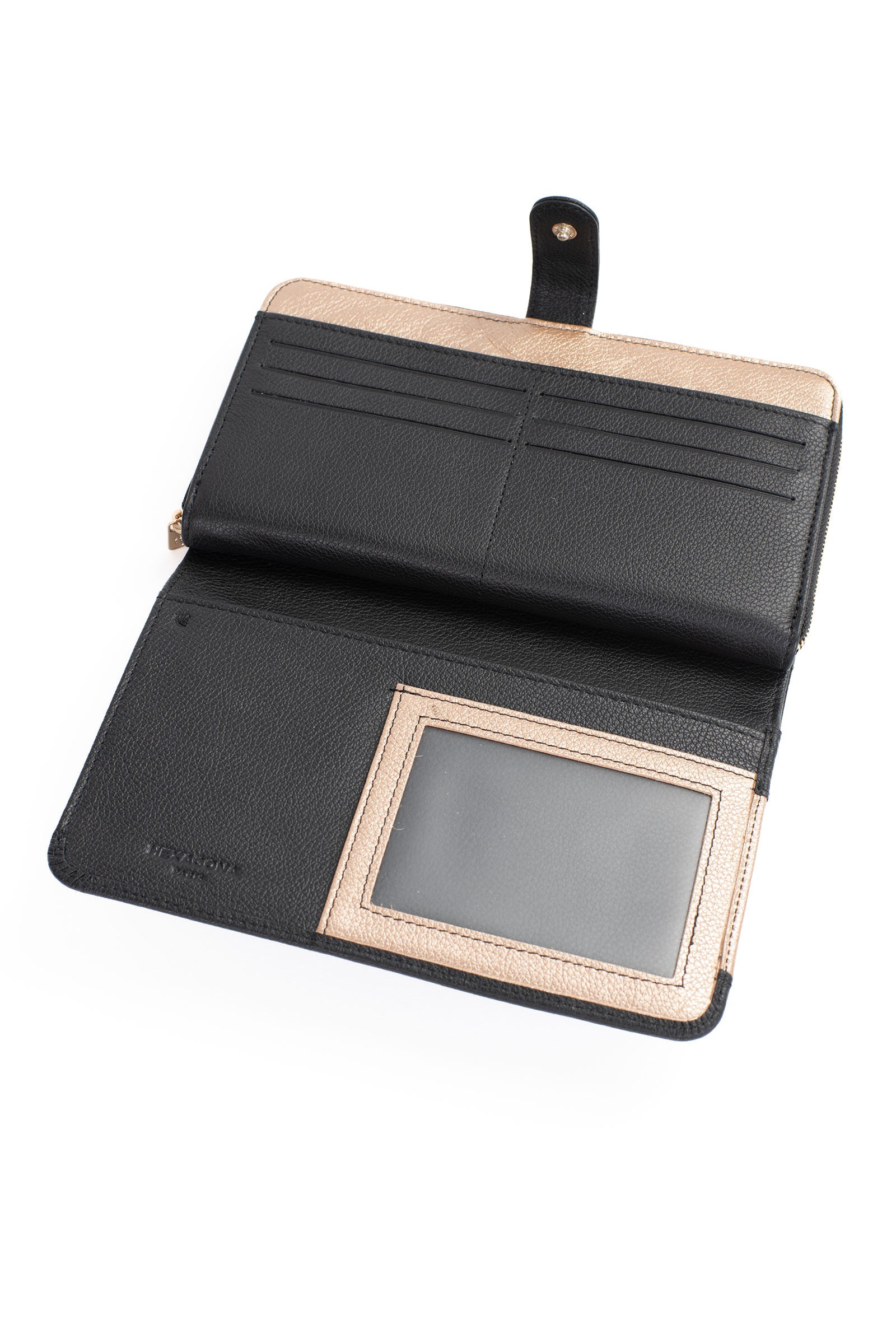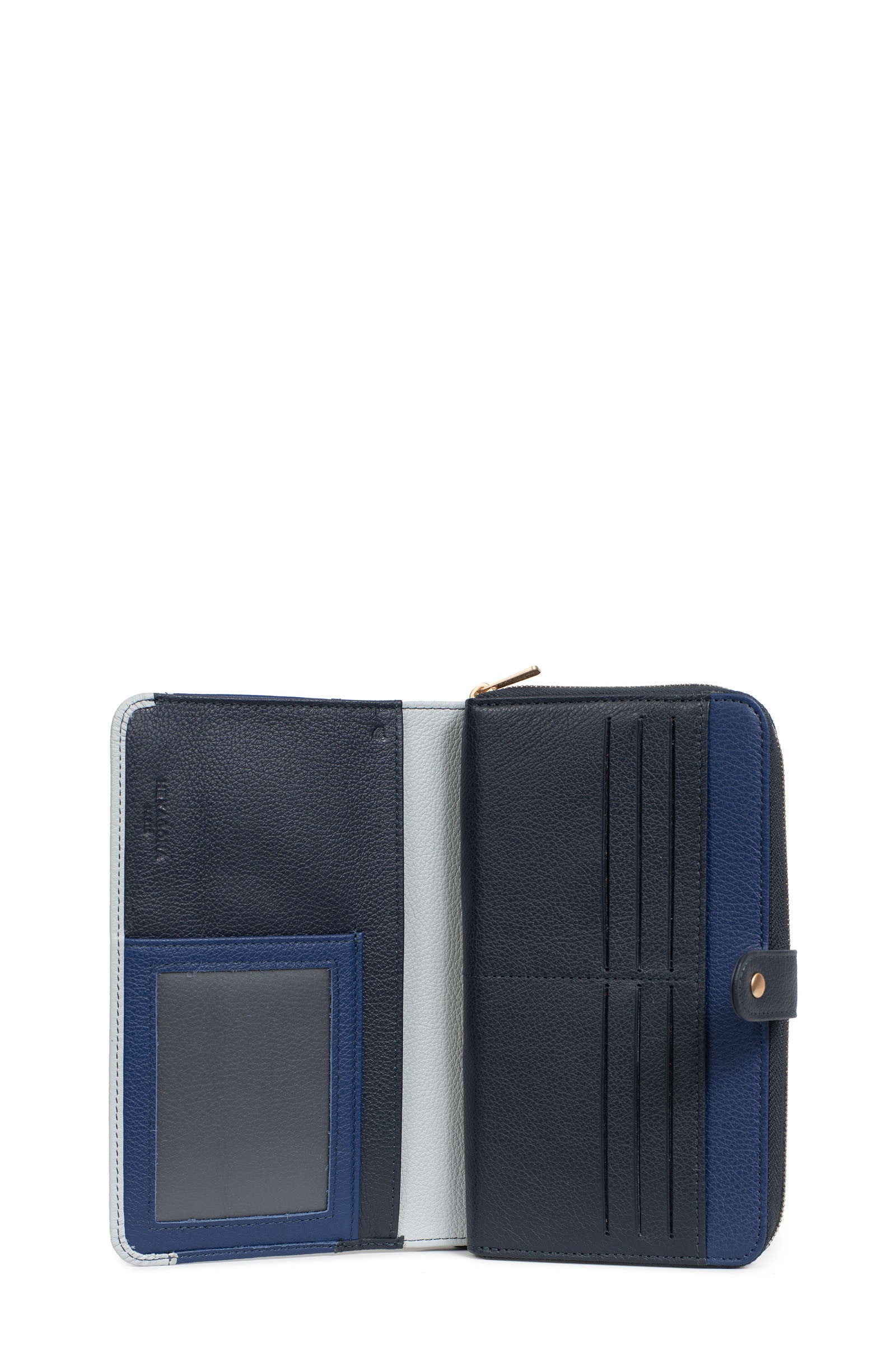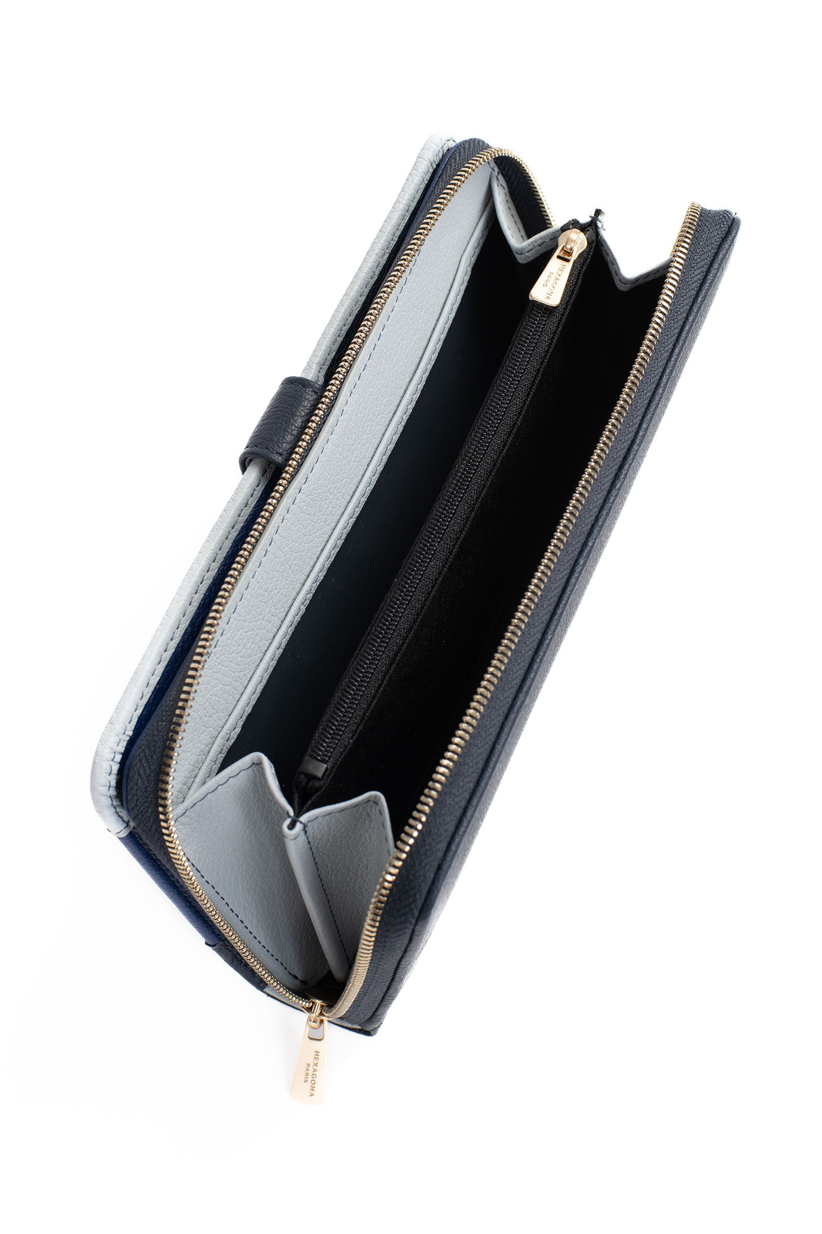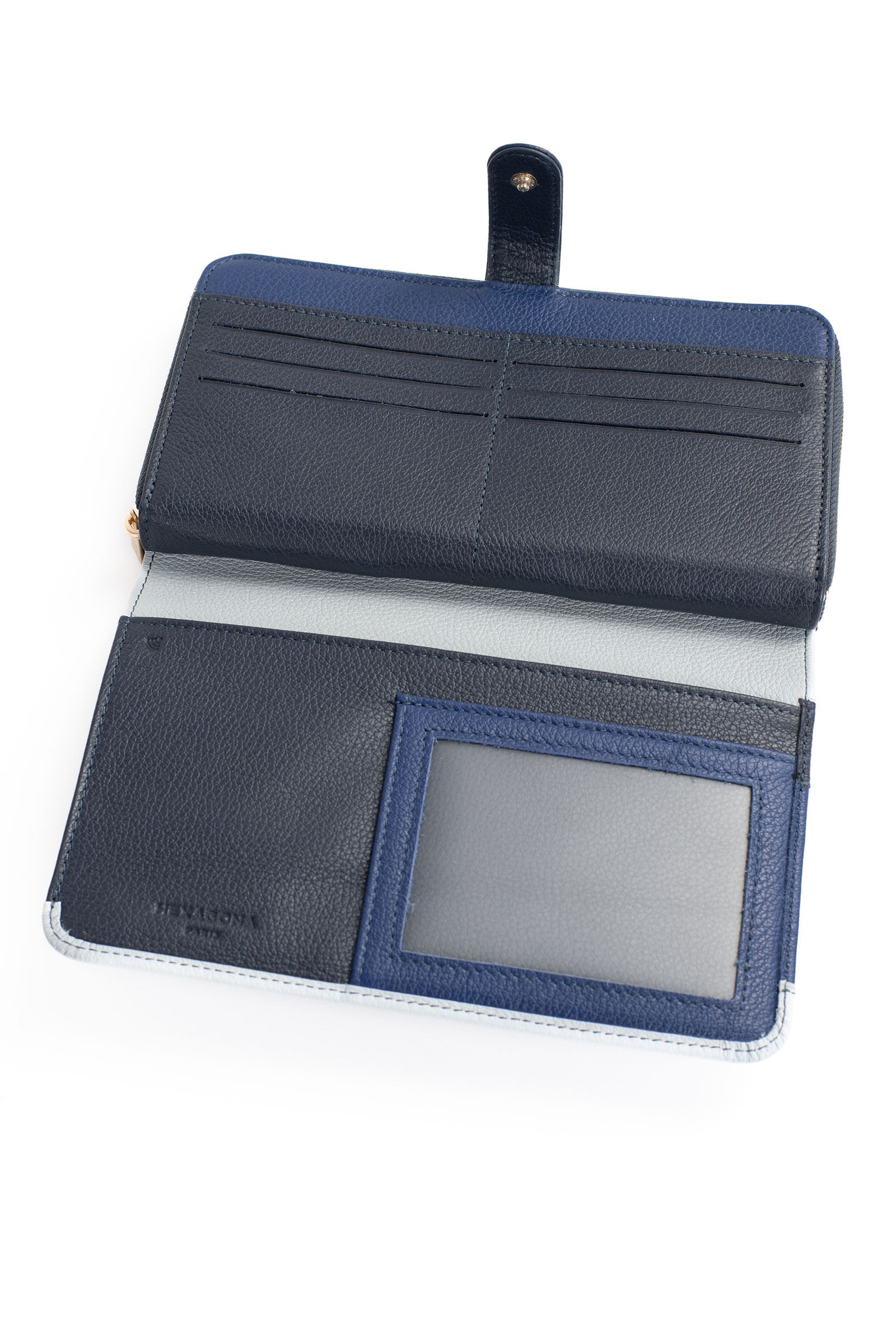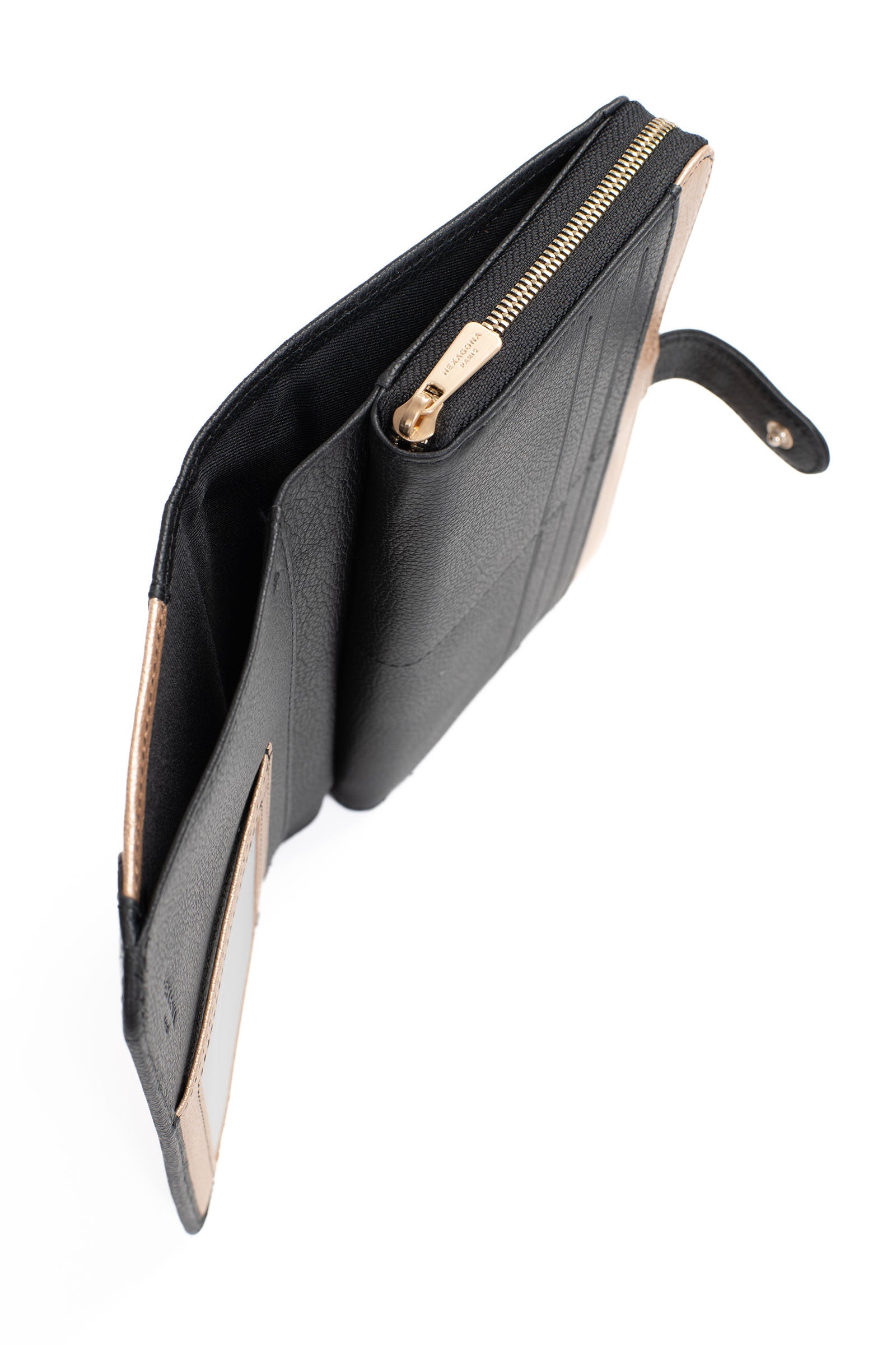 - Innen : 1 Klappe, 1 Hauptfach, 1 Reißverschlussgeldbörse, 6 flache Fächer (davon 2 mit durchsichtigem Sichtfenster), 12 Kartenfächer, 1 Geldscheinfach, 1 Scheckheftfach.