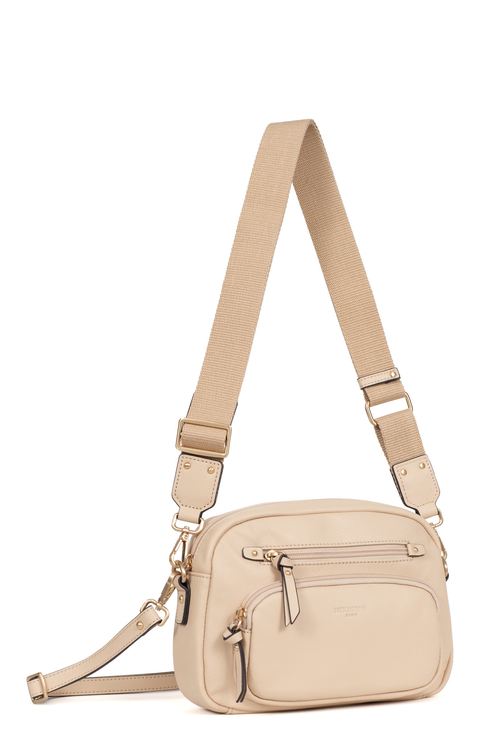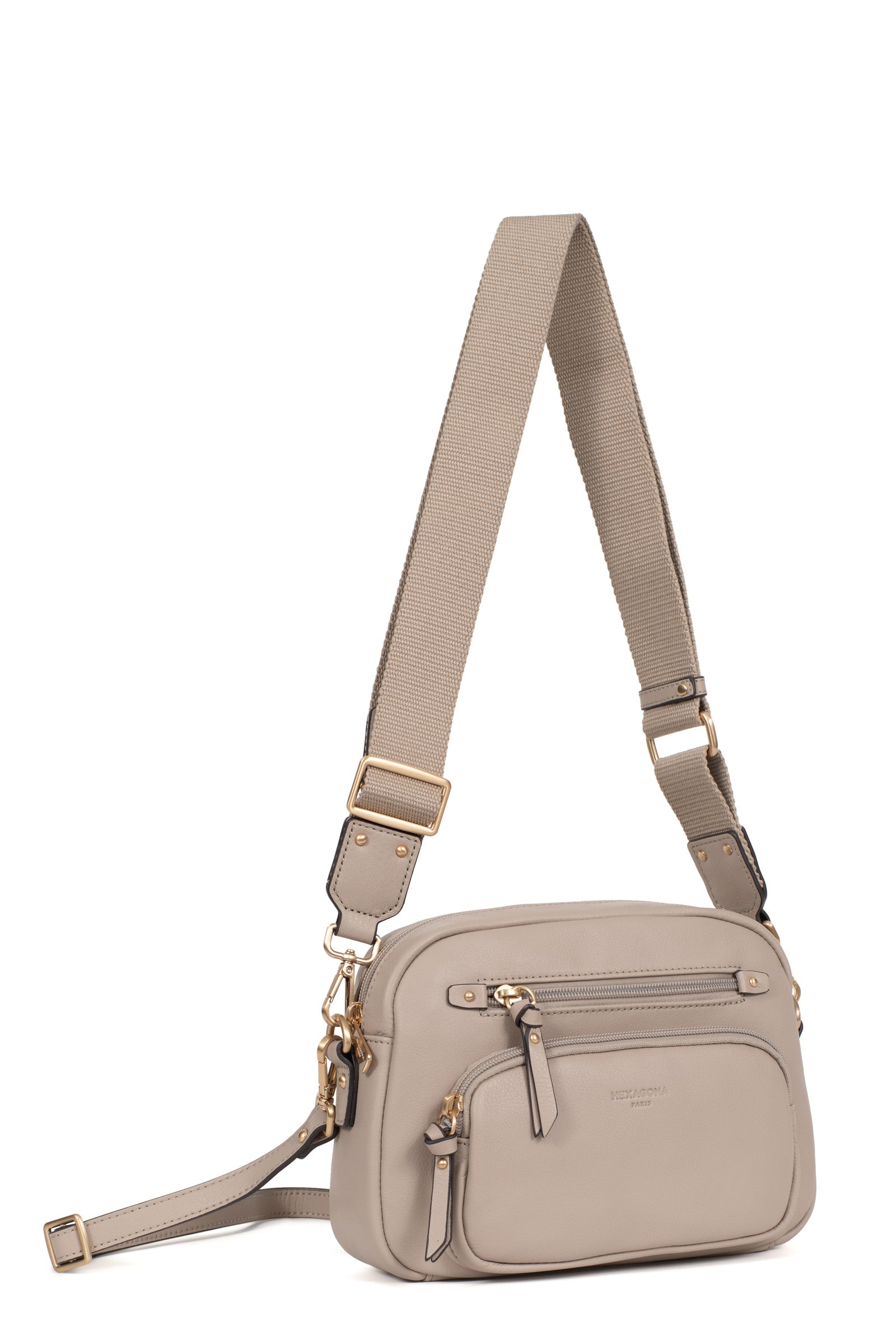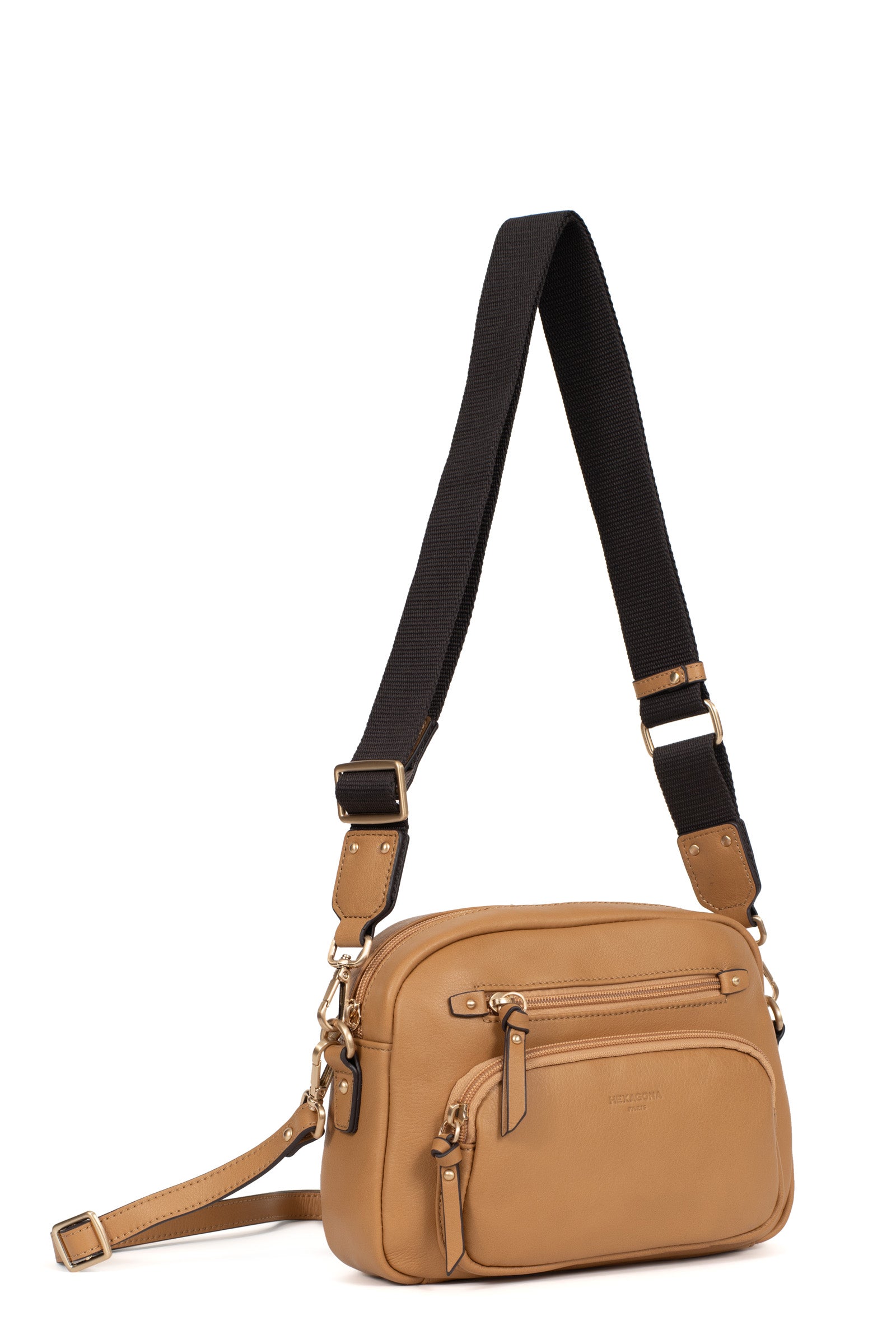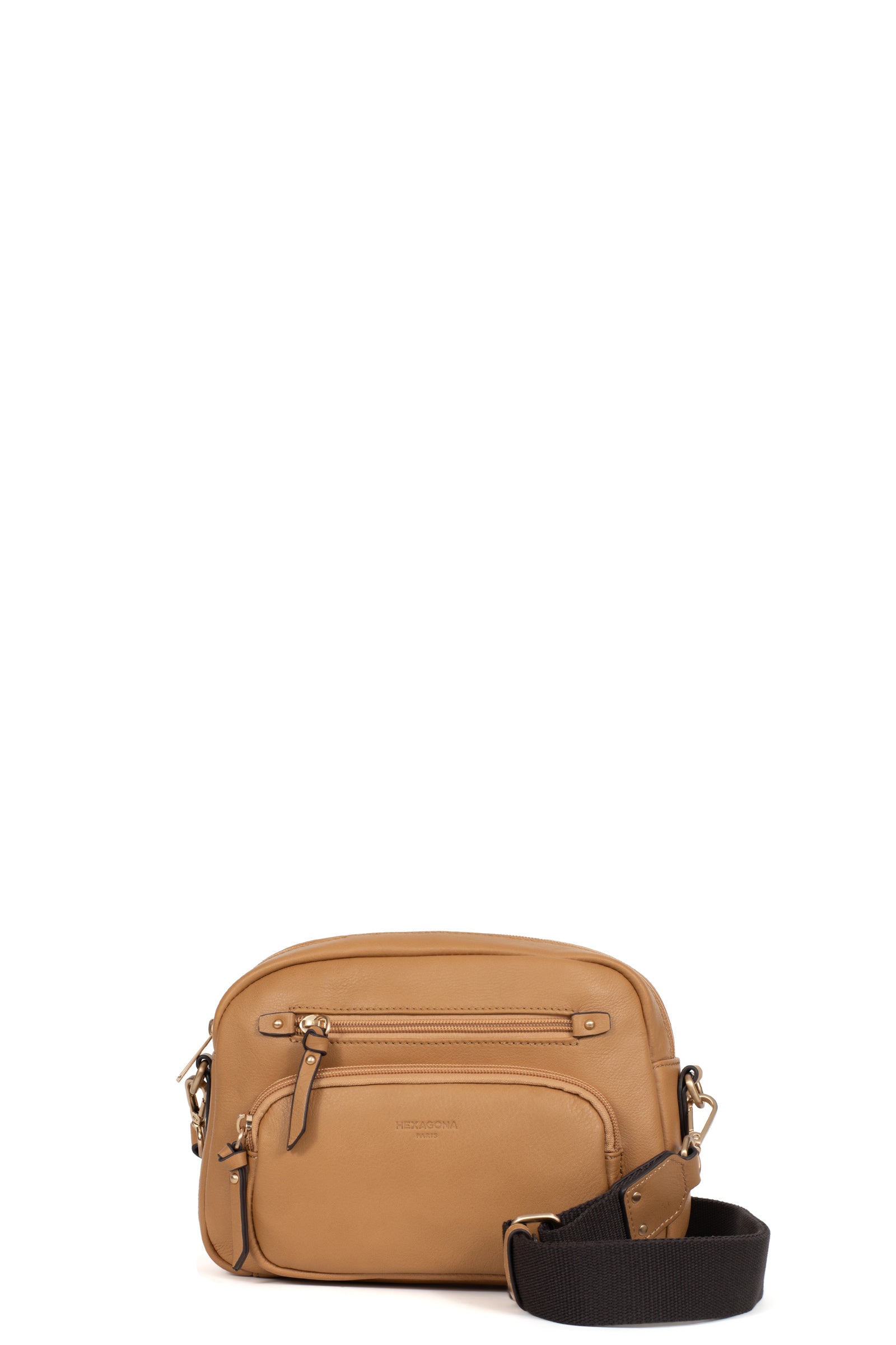Die Umhängetasche der Marke Hexagona vereint Eleganz und Praktikabilität. Ihr Design aus weichem, fettem Rindsleder verleiht ihr eine angenehme Haptik, während die Verarbeitung in gebürstetem Gold einen Hauch von Raffinesse hinzufügt.