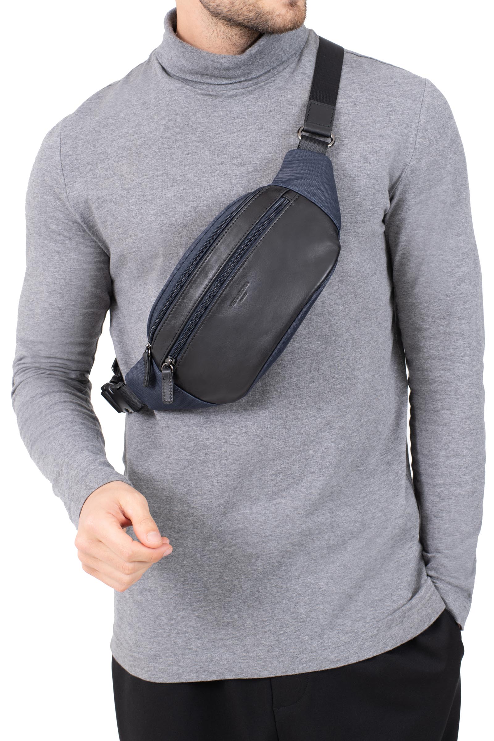 Erhältlich in mehreren Farben, darunter Schwarz, Marineblau und Braun, zeichnet sich diese Tasche durch ihre runde und kompakte Form aus, die das Tragen um die Taille oder als Umhängetasche erleichtert. Die Reißverschlusstaschen ermöglichen eine organisierte Aufbewahrung Ihrer Essentials und garantieren gleichzeitig einen schnellen Zugriff auf Ihre persönlichen Gegenstände.