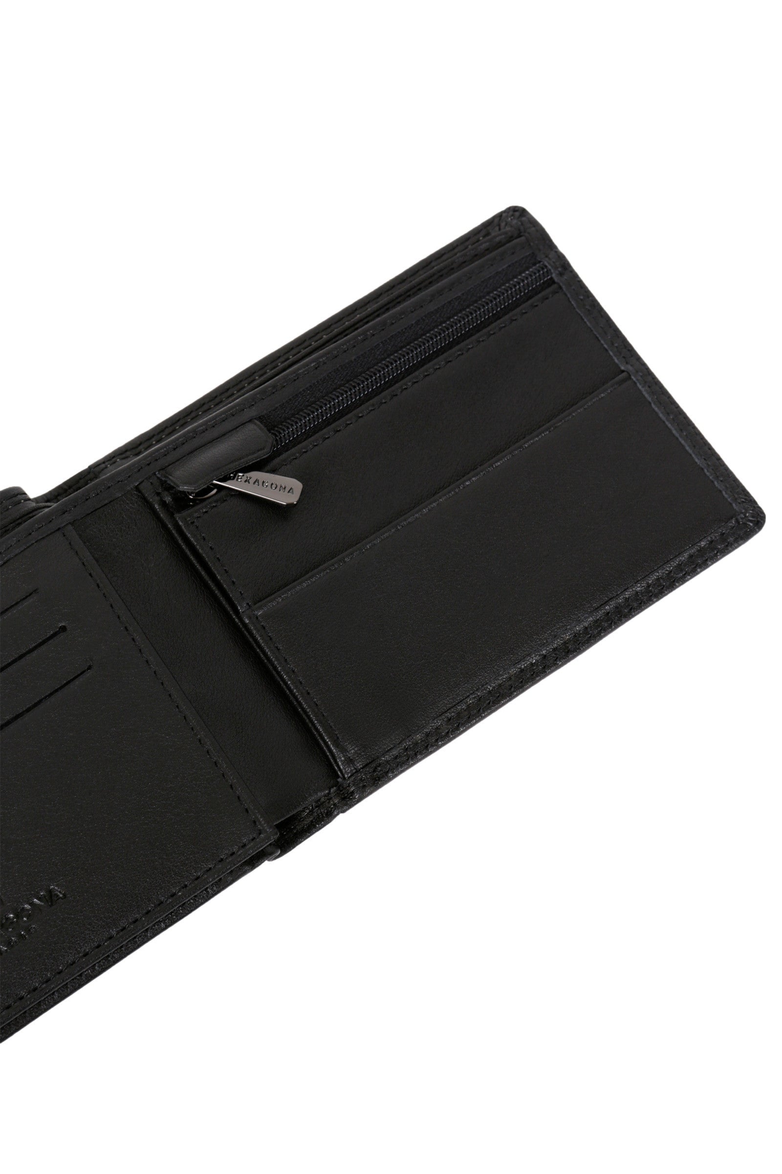 Innen: 2 Fächer. 1 Reißverschluss-Münzfach. 5 flache Taschen (davon 1 mit Sichtfenster). 5 Kartenfächer. 2 Geldscheinfächer.