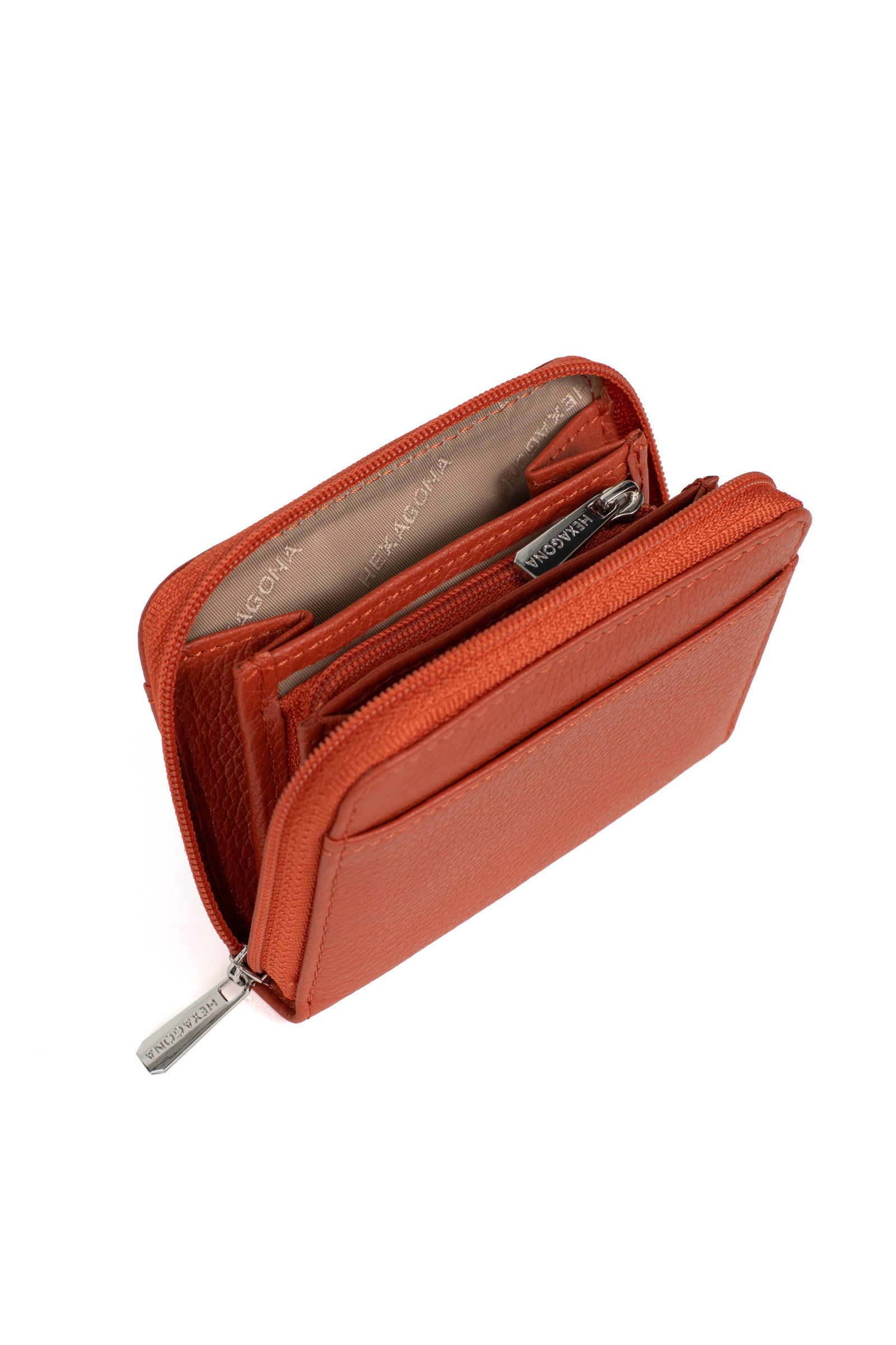 Innen: 1 Hauptfach. 1 Reißverschluss-Münzfach. 3 flache Taschen. 2 Kartenfächer.