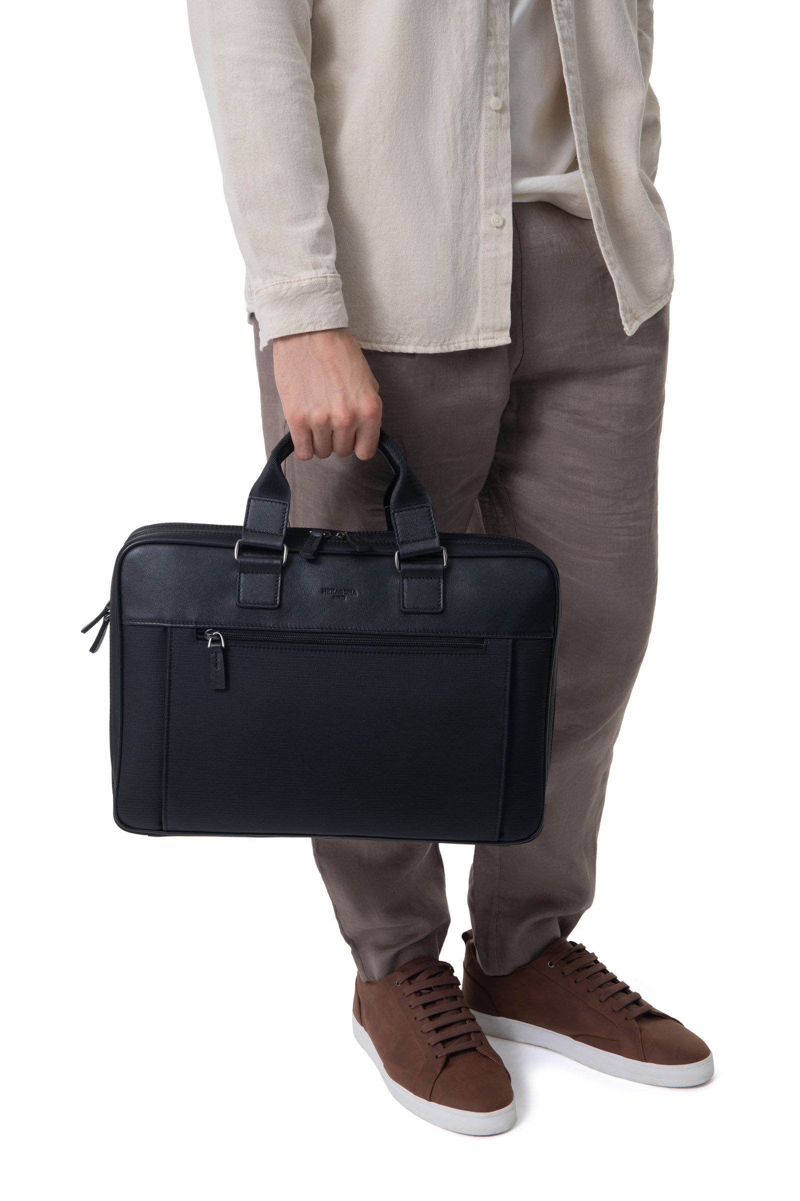 - Interior: 2 main compartments with 1 padded laptop compartment. 1 flat zipped pocket. 4 flat pockets (including 1 phone compartment). 2 pen holders.