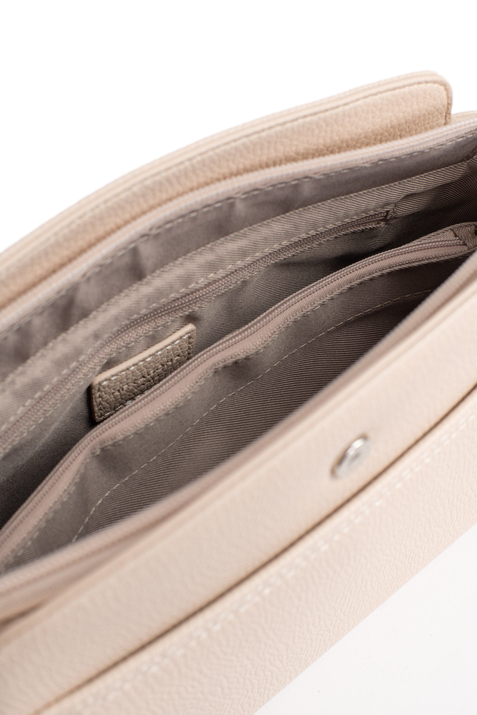 Interior: Interior: 1 main compartment with 1 zipped divider pocket. 1 flat zipped pocket. 1 flat pocket.