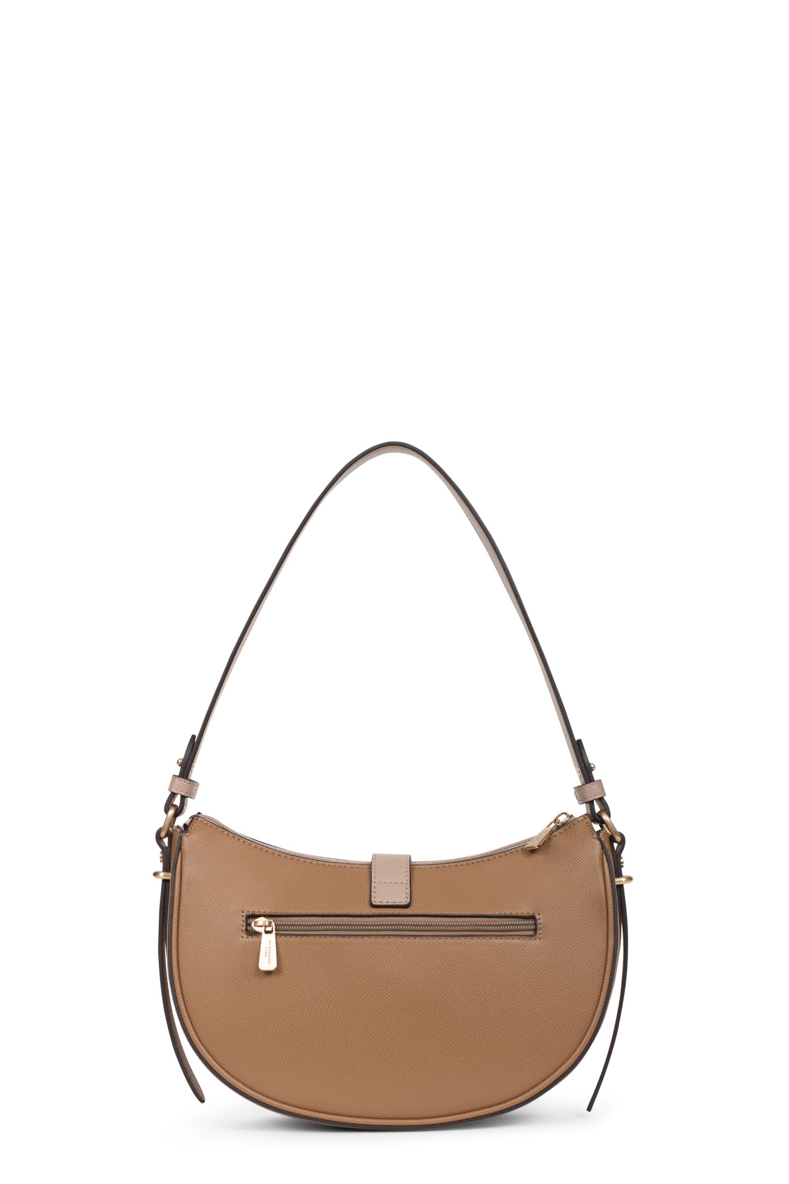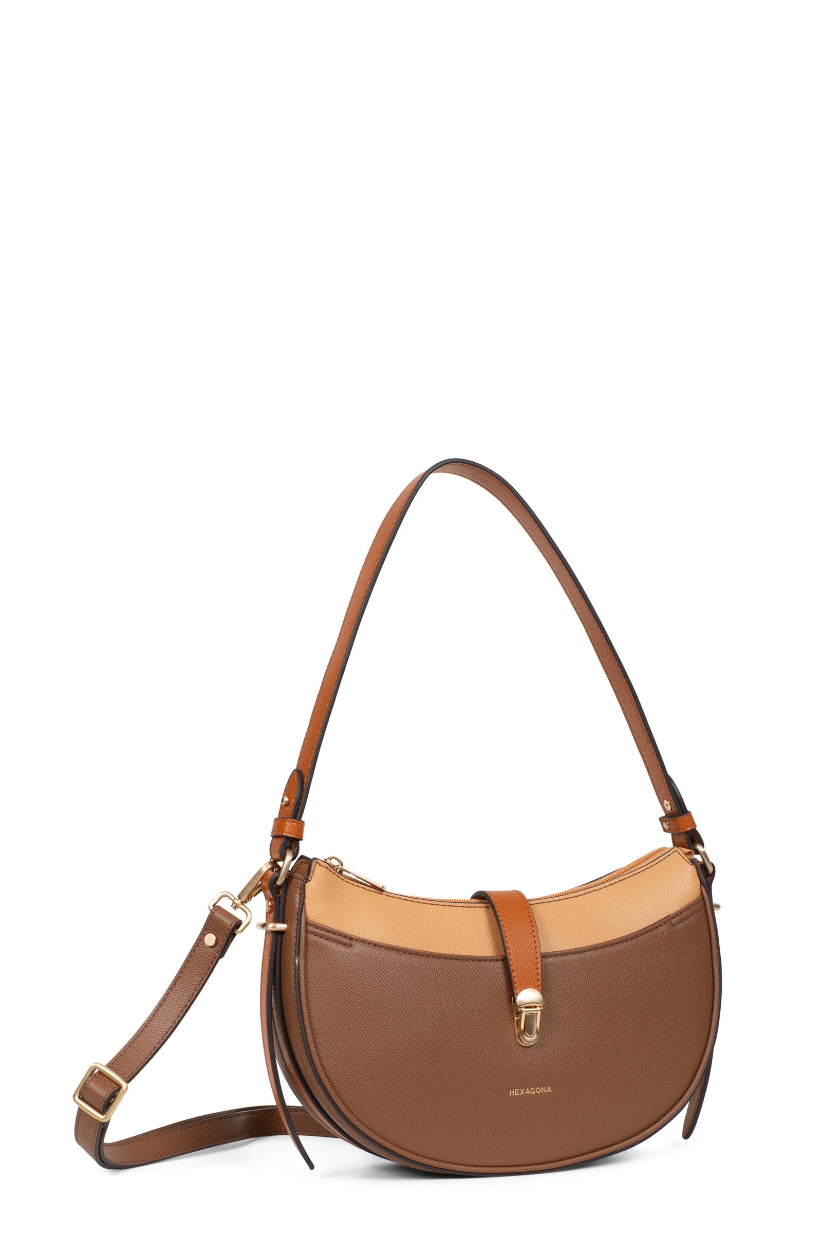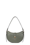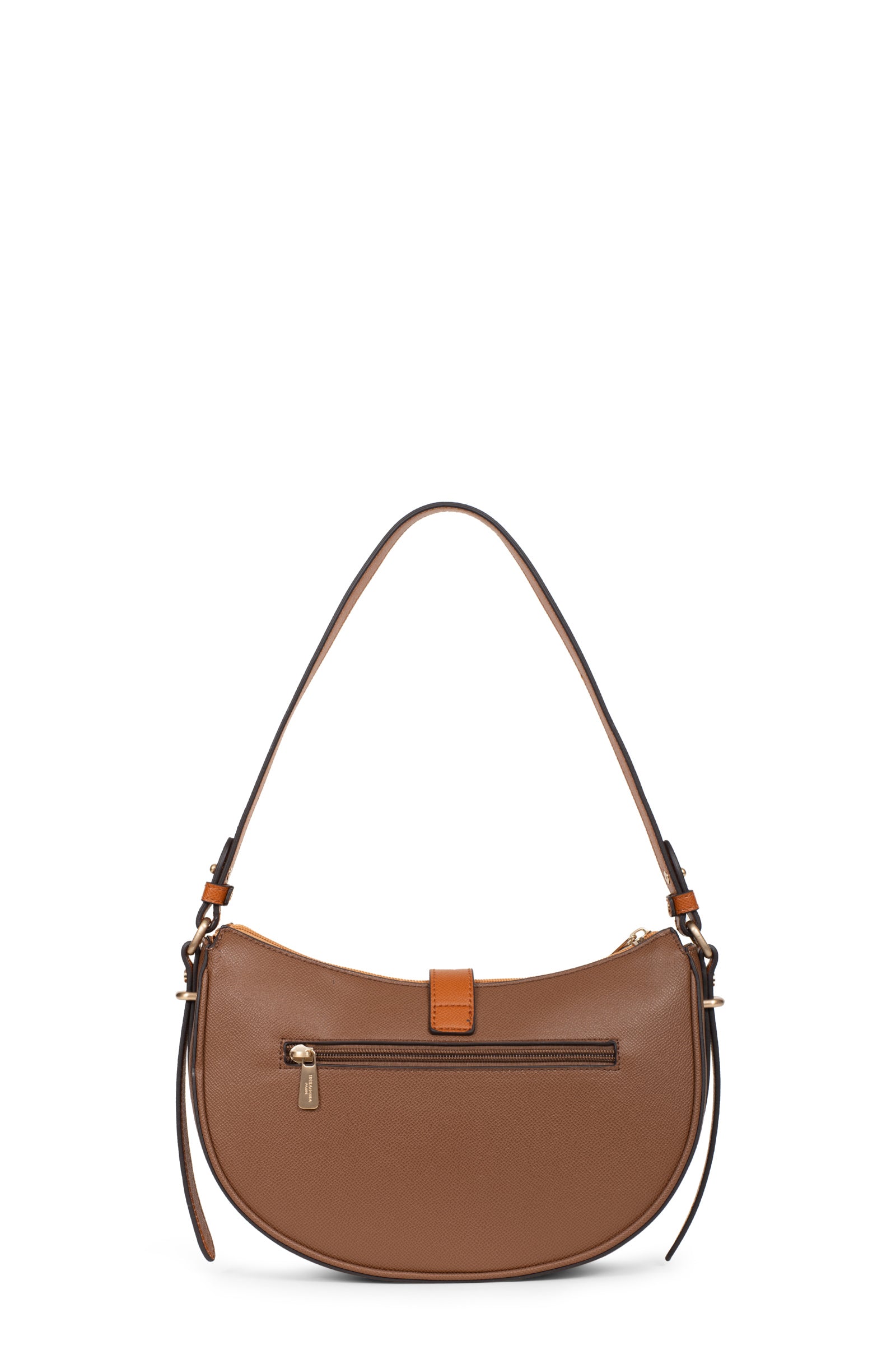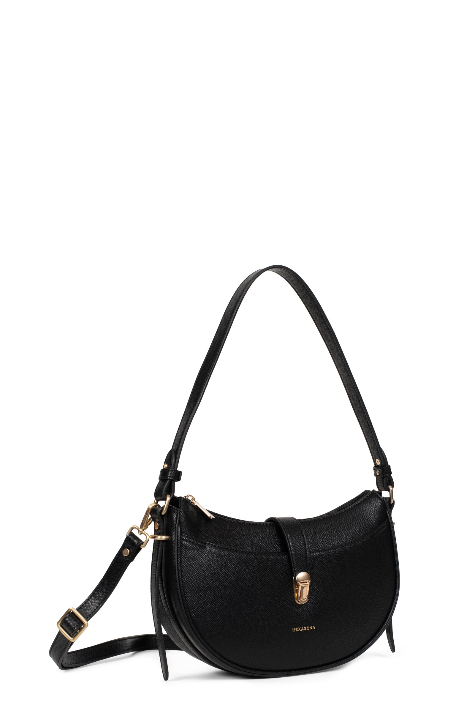 Crafted from high-quality faux leather, this bag features a lightly grained texture that adds character and sophistication. Gold-tone hardware adds a touch of luxury, while its rounded shape evokes a semi-lunar silhouette, giving it a chic yet casual look.