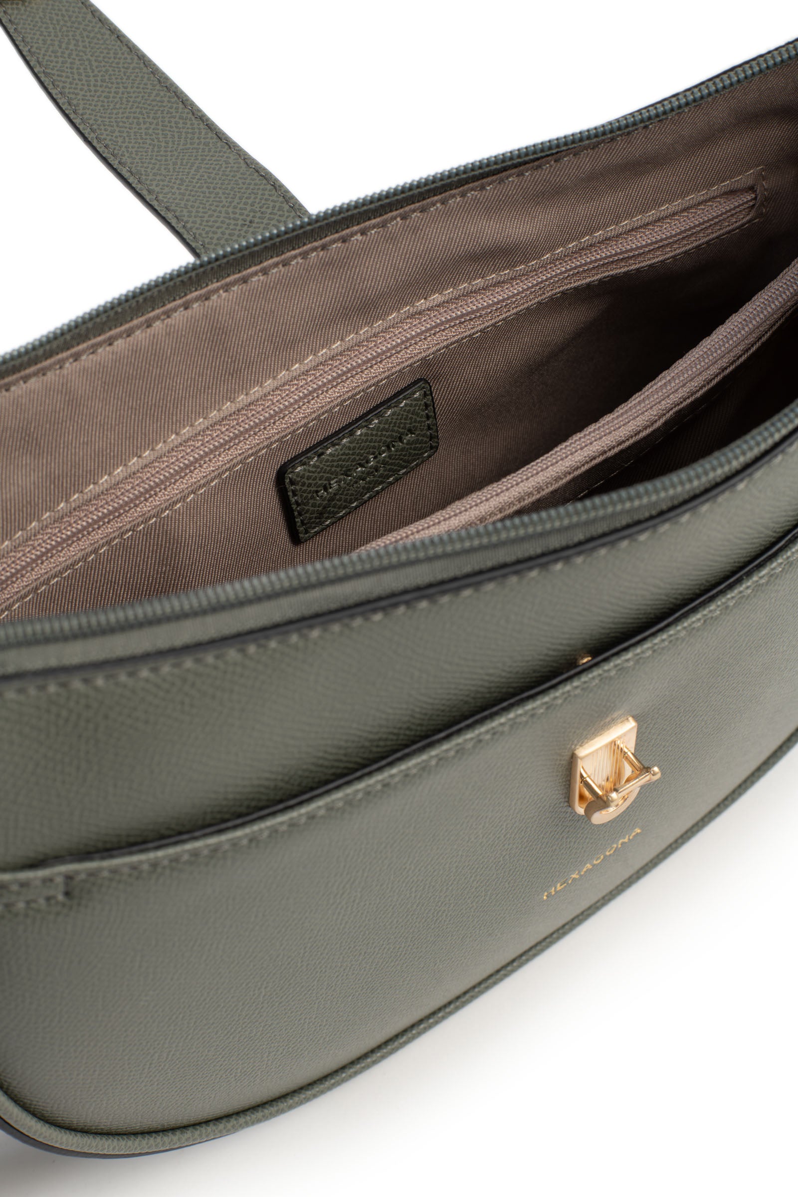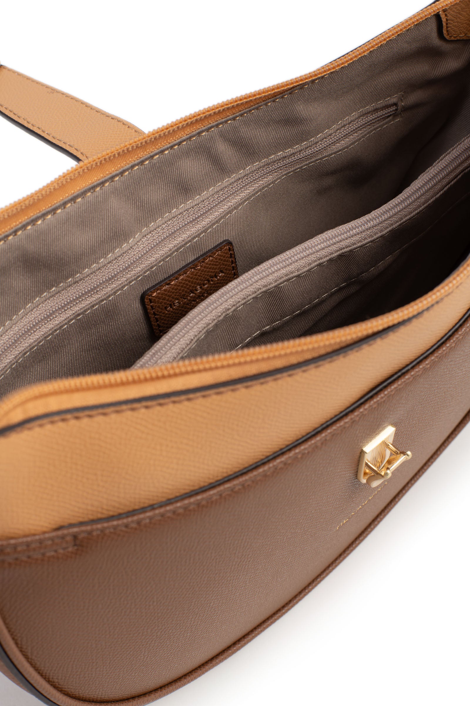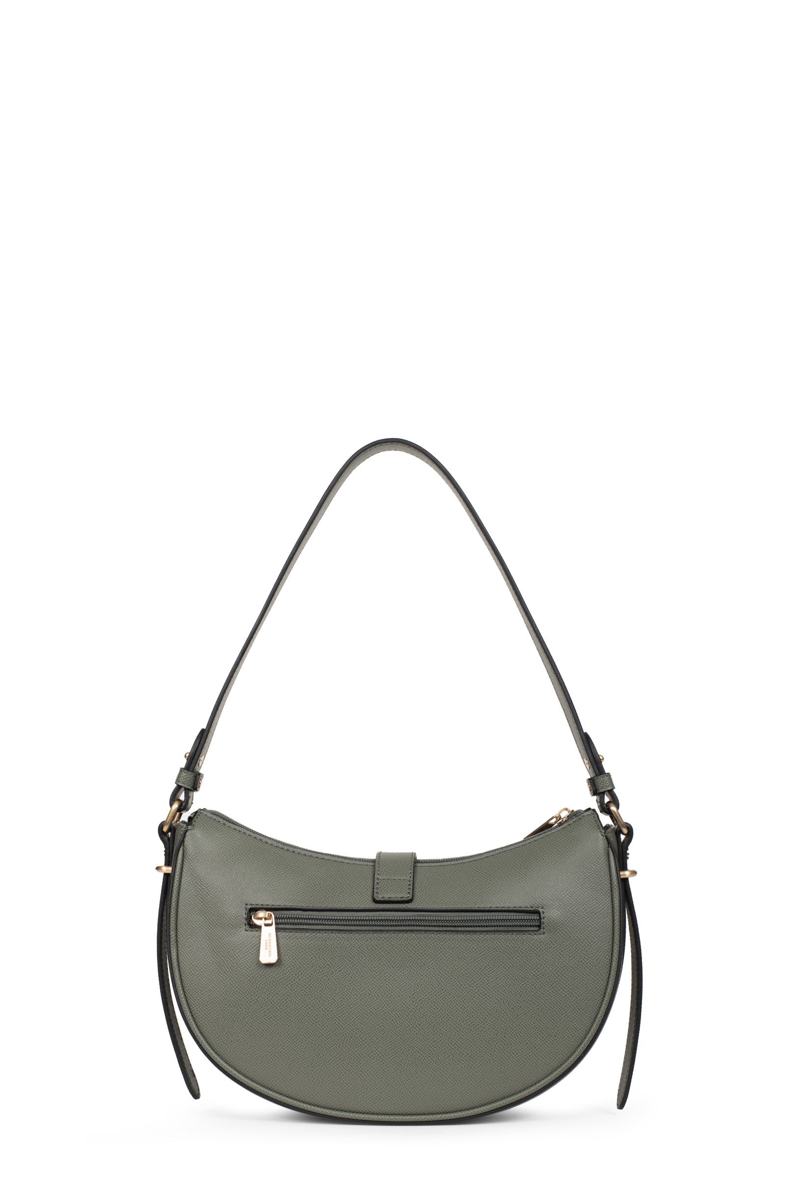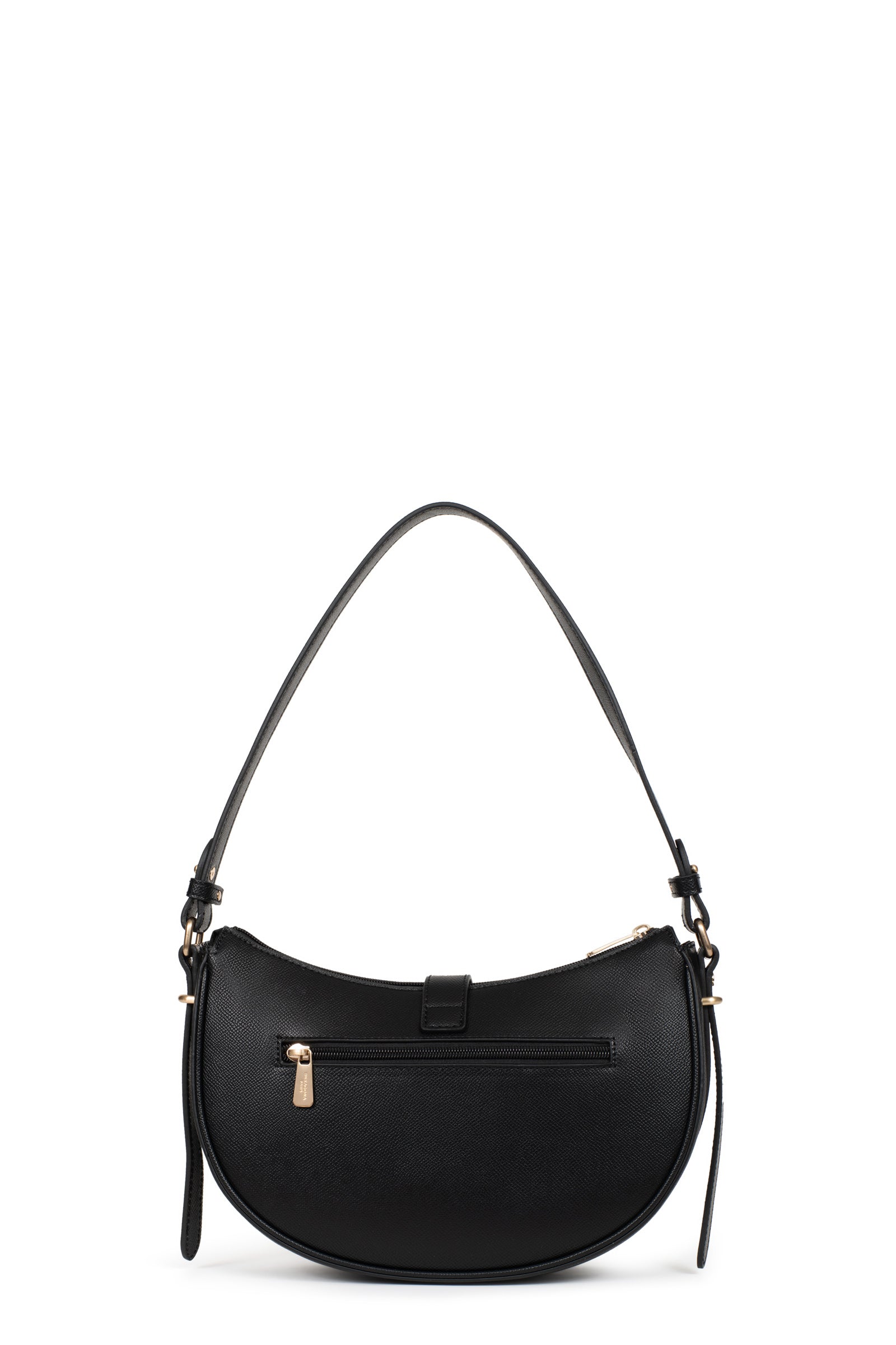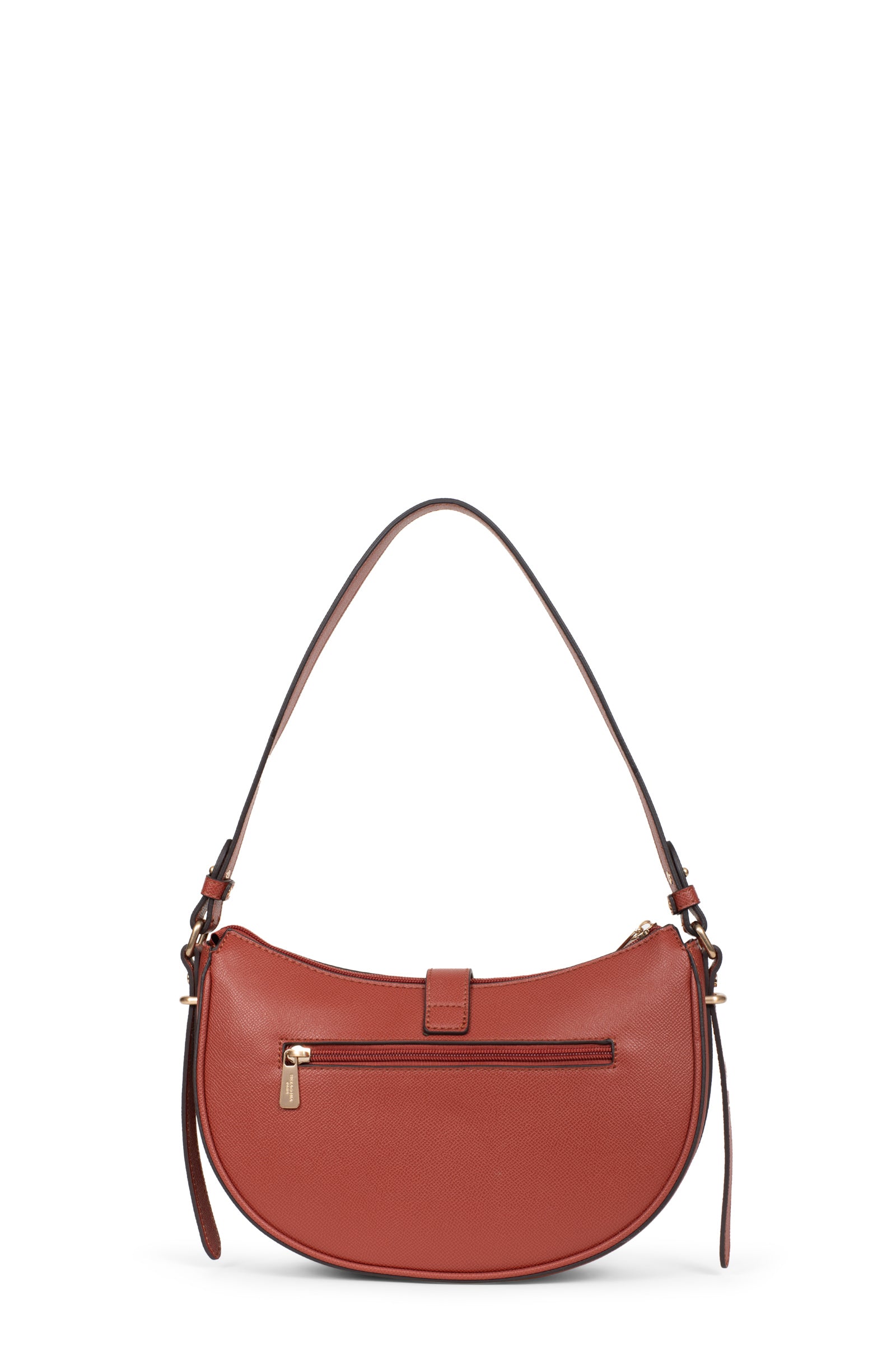 Crafted from high-quality faux leather, this bag features a lightly grained texture that adds character and sophistication. Gold-tone hardware adds a touch of luxury, while its rounded shape evokes a semi-lunar silhouette, giving it a chic yet casual look.