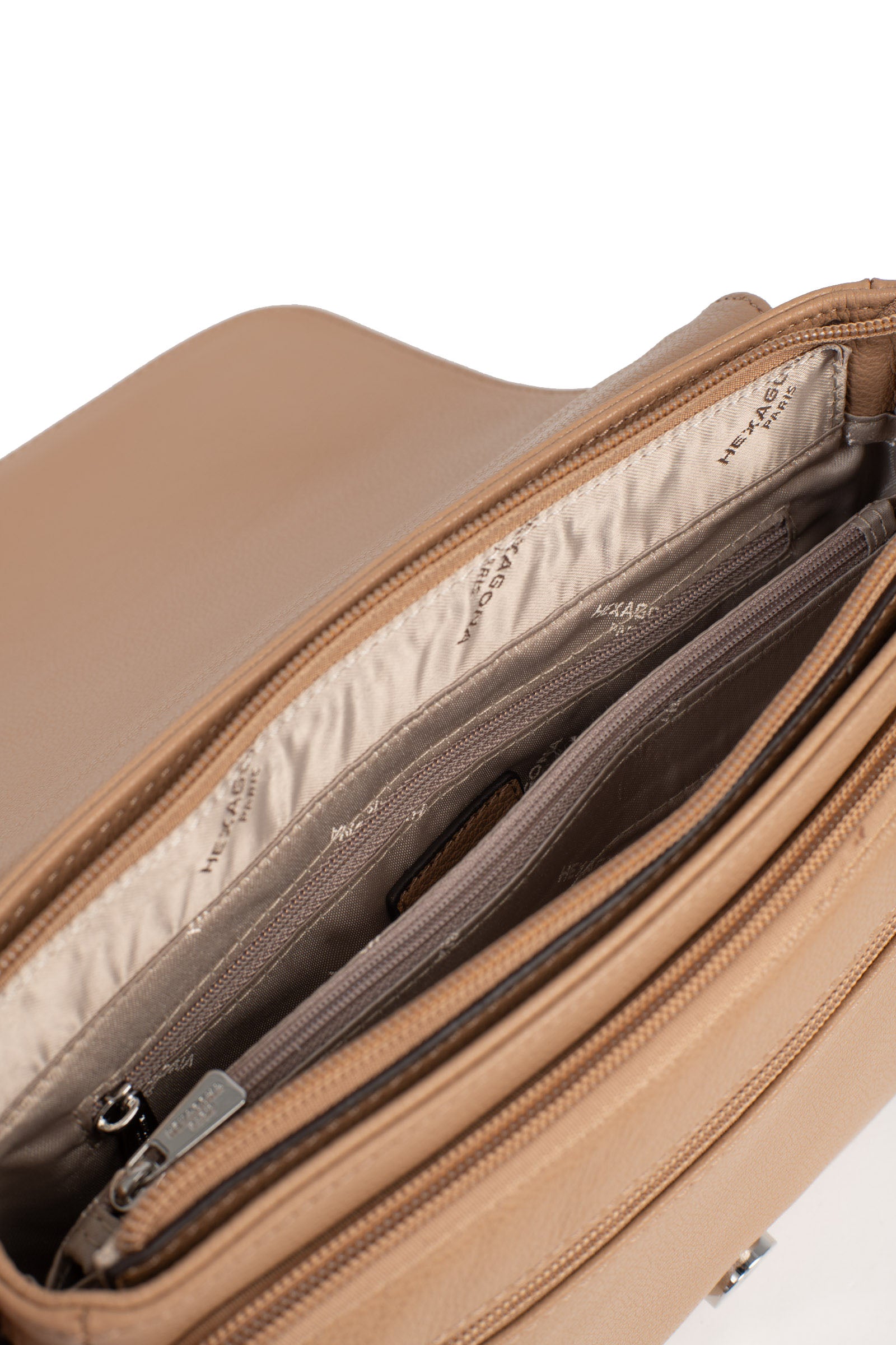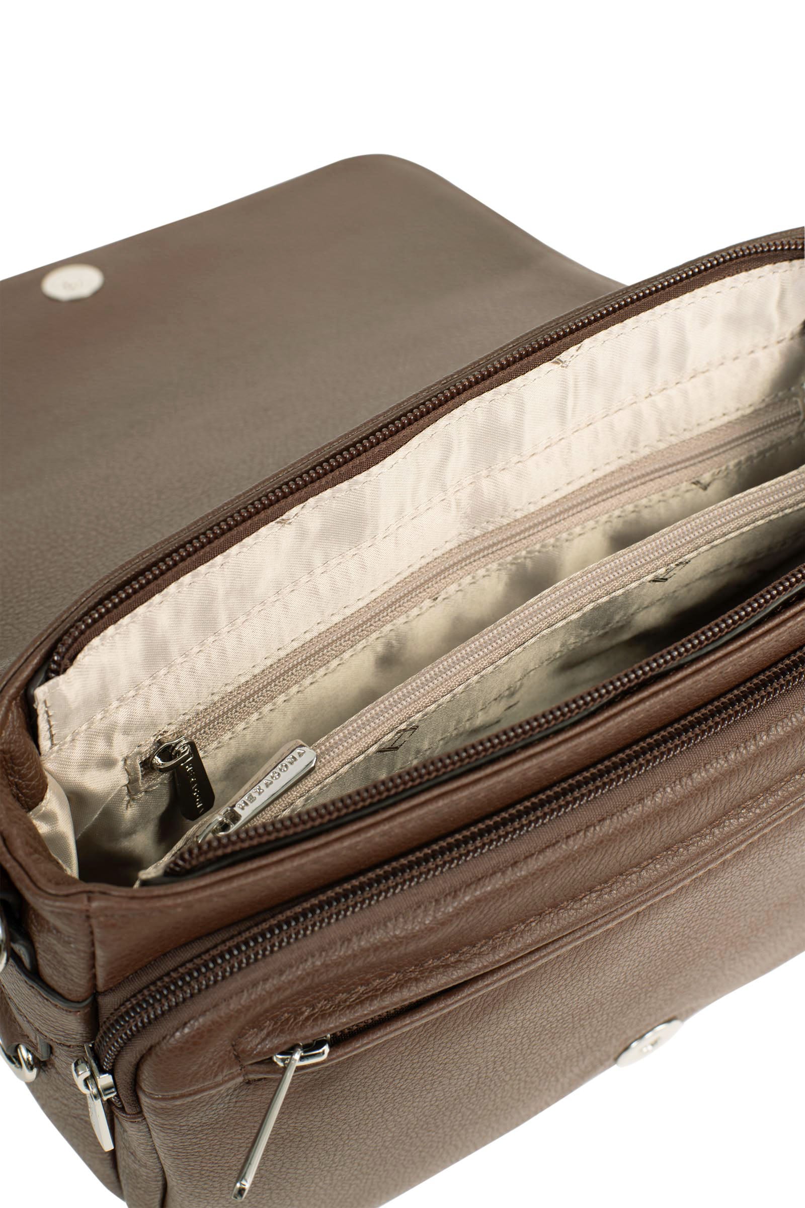 - Buitenkant: 2 voorvakken met ritssluiting (waarvan 1 plat) met 2 platte vakken (waarvan 1 telefoonvak). 1 platte achterzak met ritssluiting.
