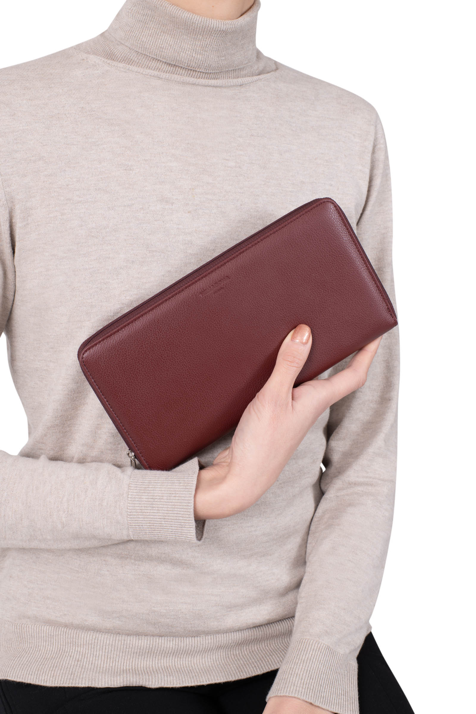 - Intérieur : 1 volet, 1 compartiment principal, 1 porte-monnaie zippé, 10 poches plates (dont 1 à vue transparente), 14 emplacements carte, 1 espace chéquier, 1 étui plastique amovible pour carte grise.