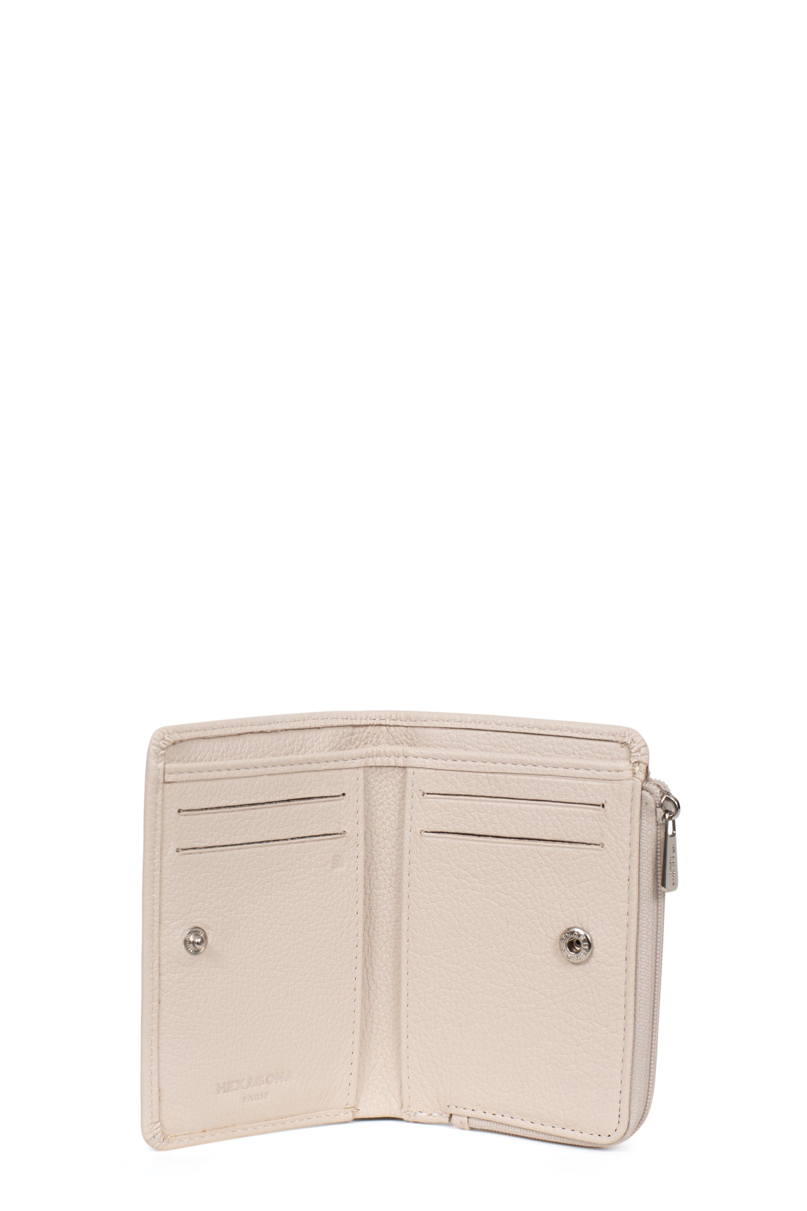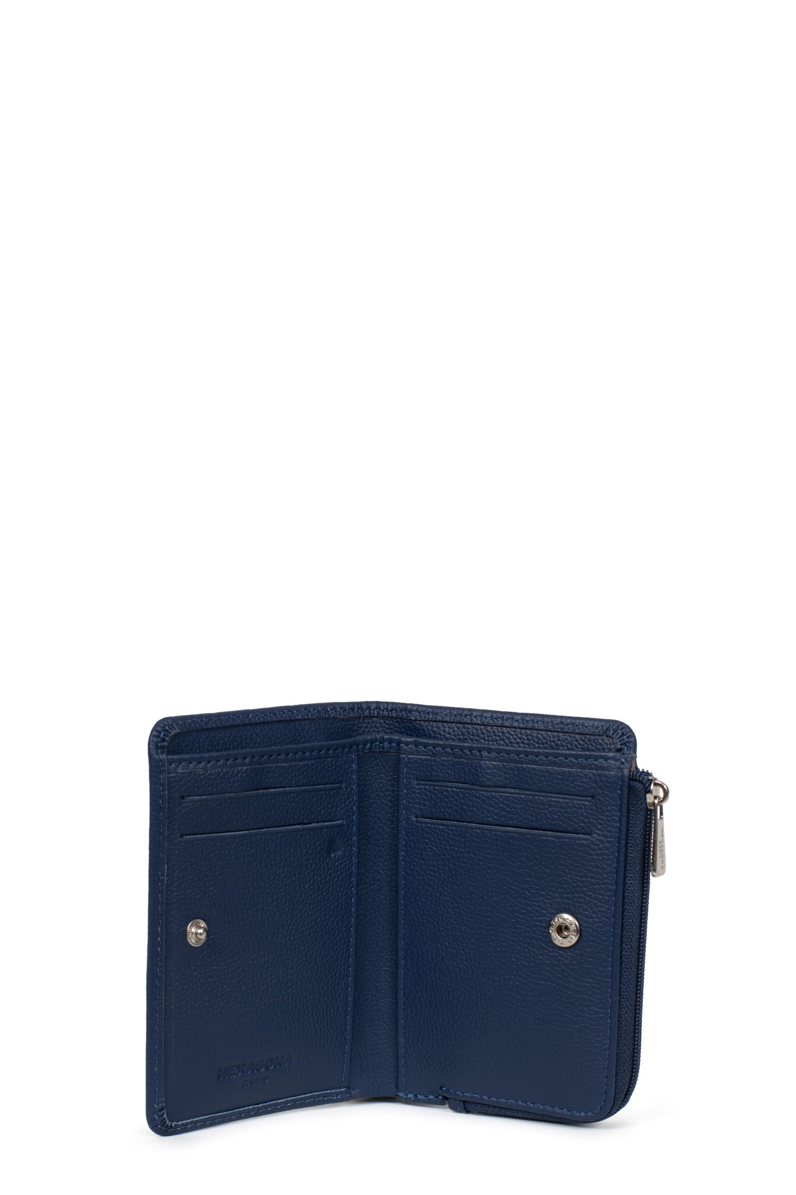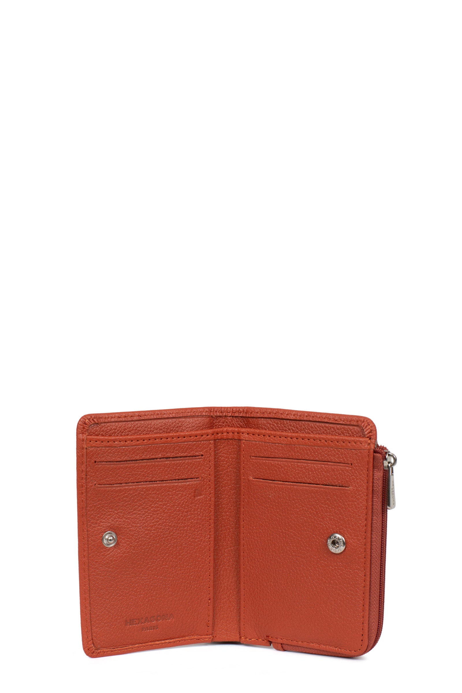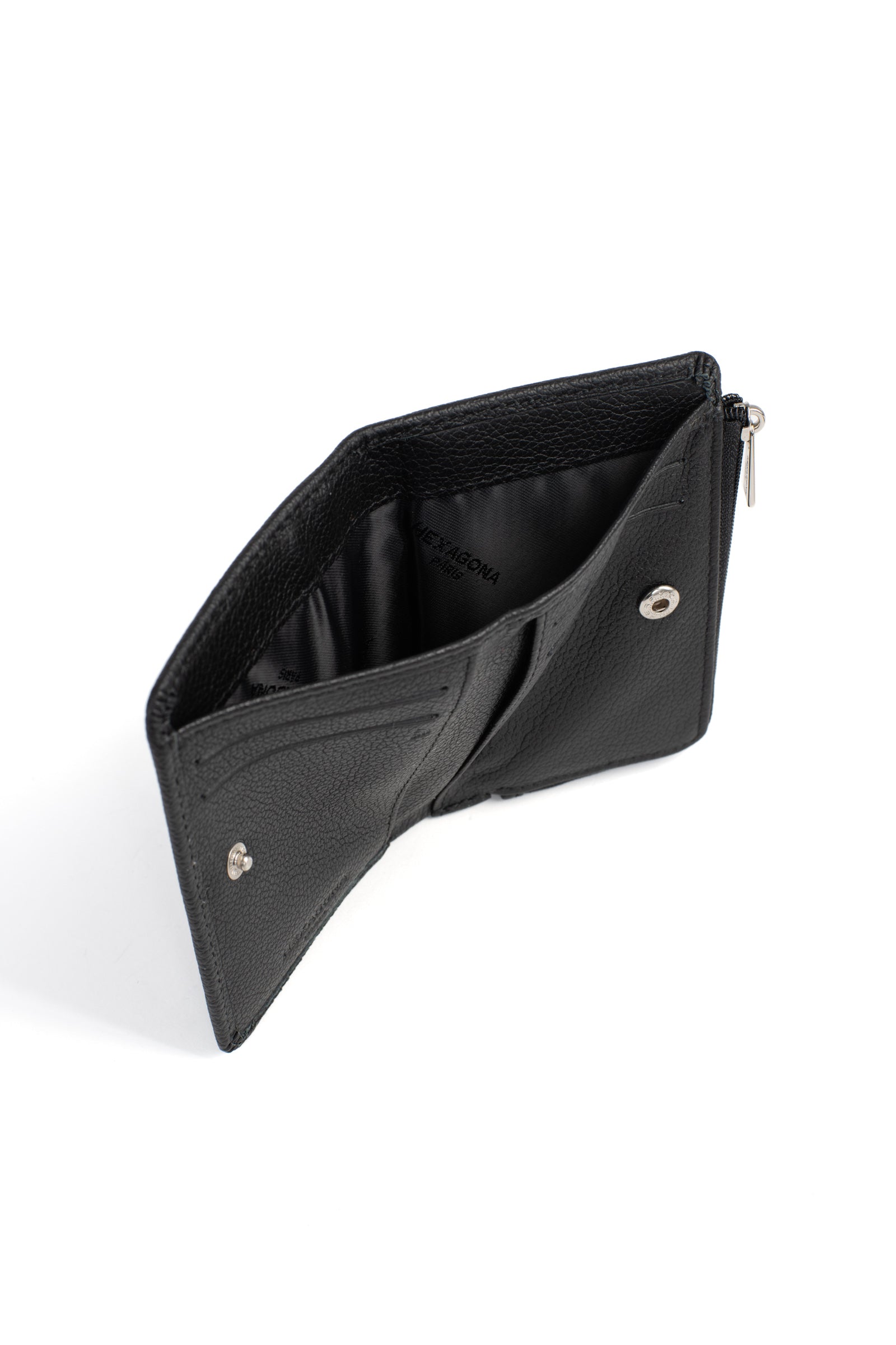 Intérieur : 1 volet. 1 porte-monnaie zippé. 3 poches plates. 4 emplacements carte. 1 poche billets.