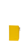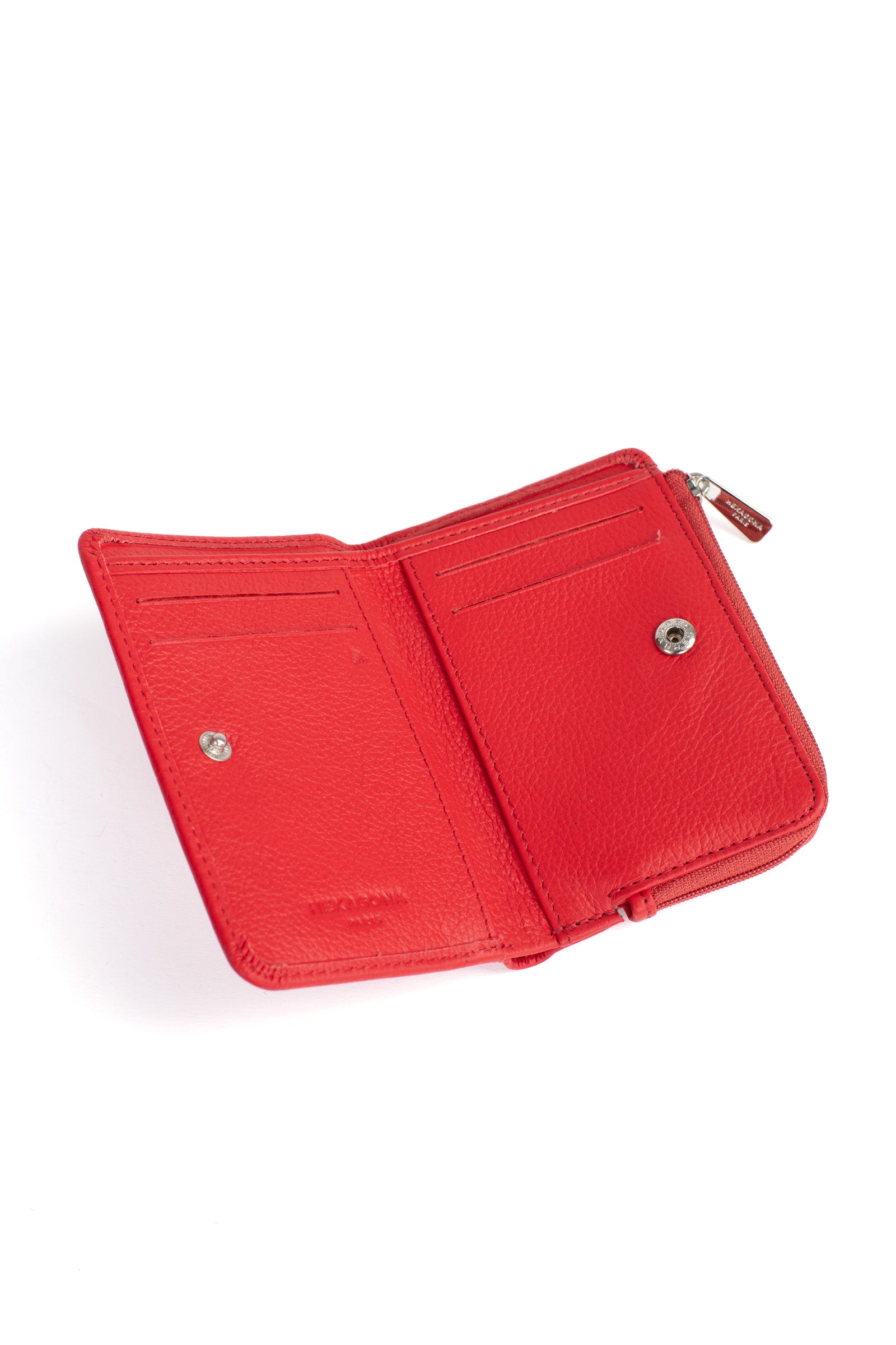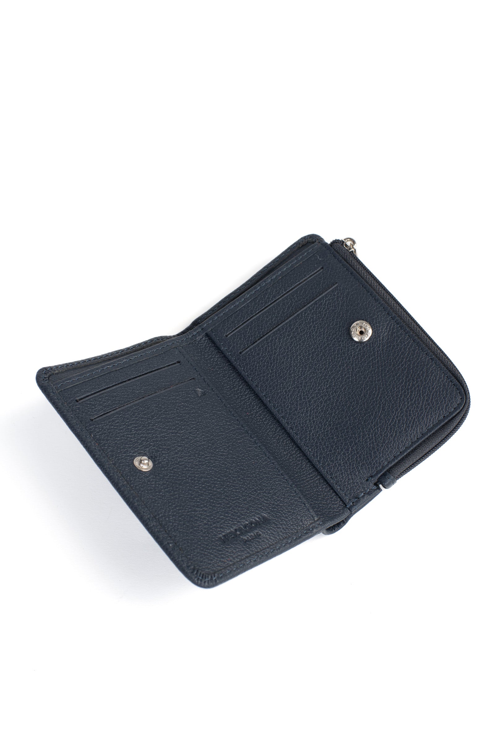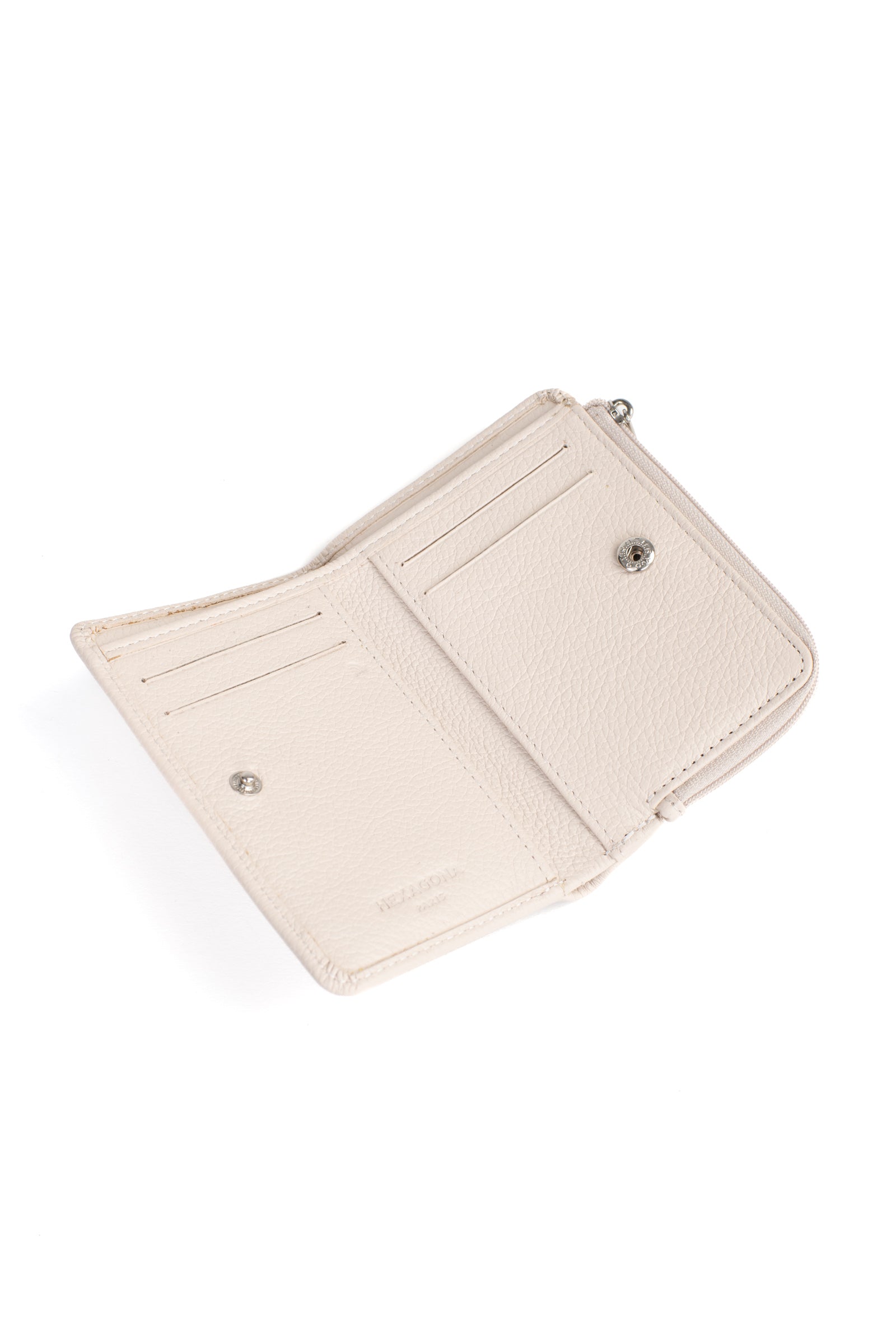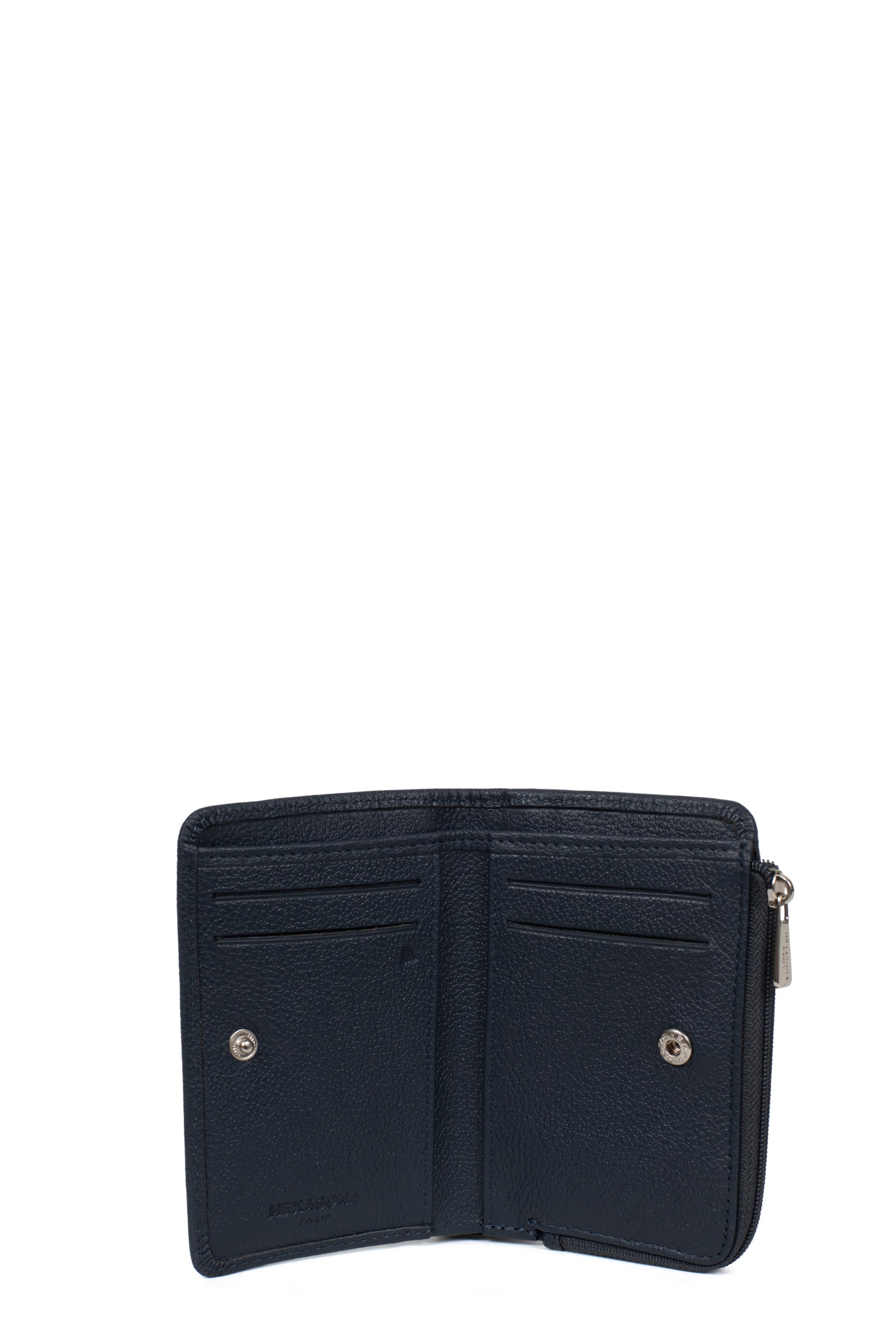 Intérieur : 1 volet. 1 porte-monnaie zippé. 3 poches plates. 4 emplacements carte. 1 poche billets.
