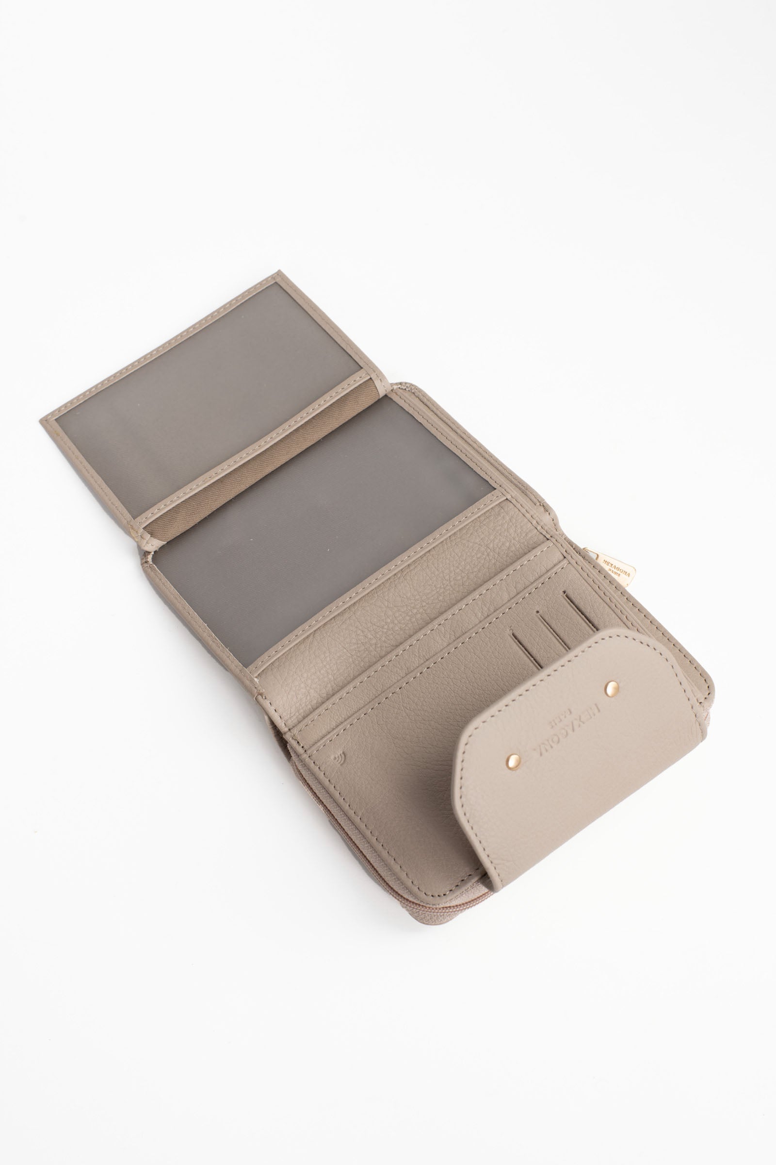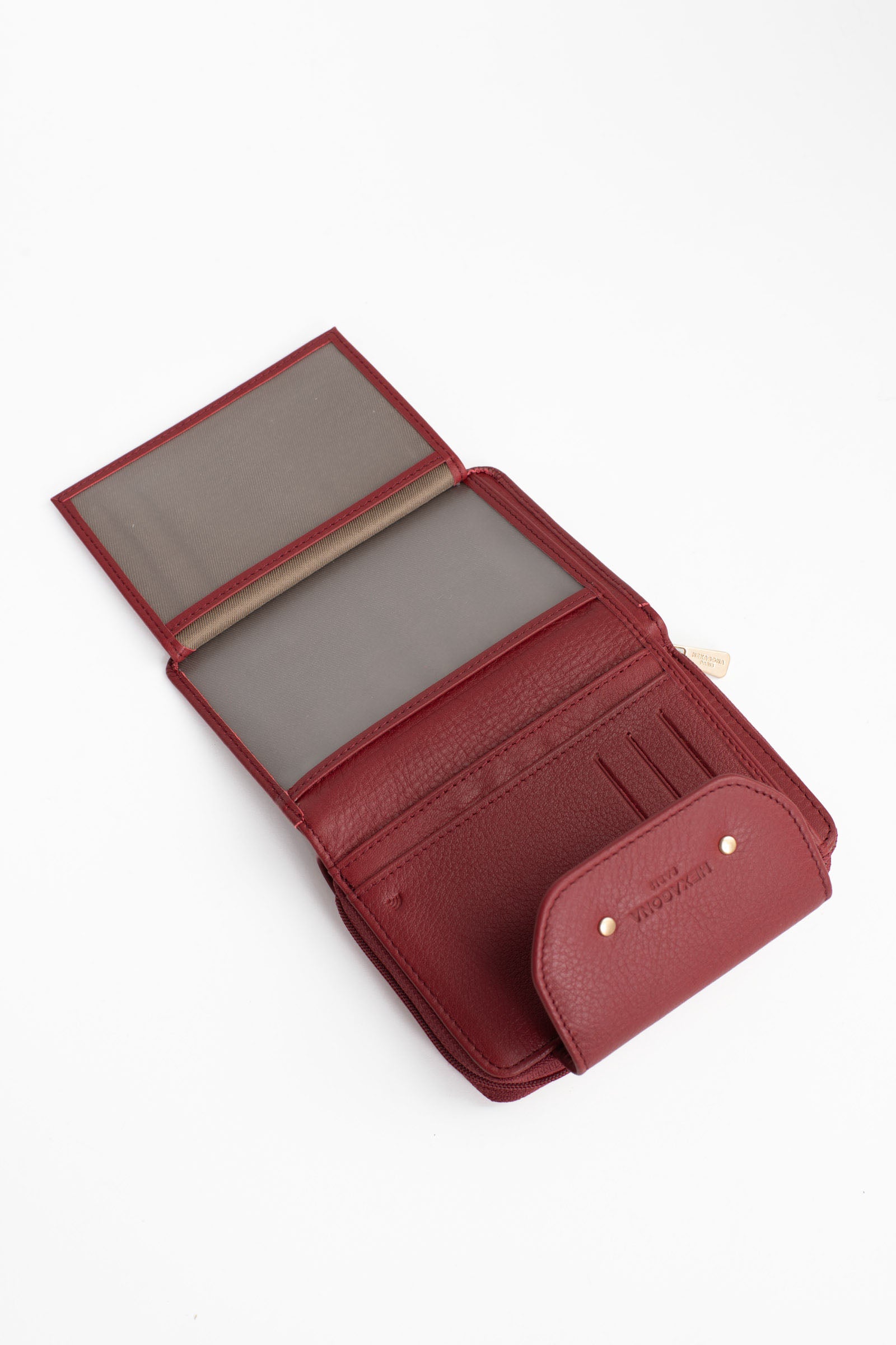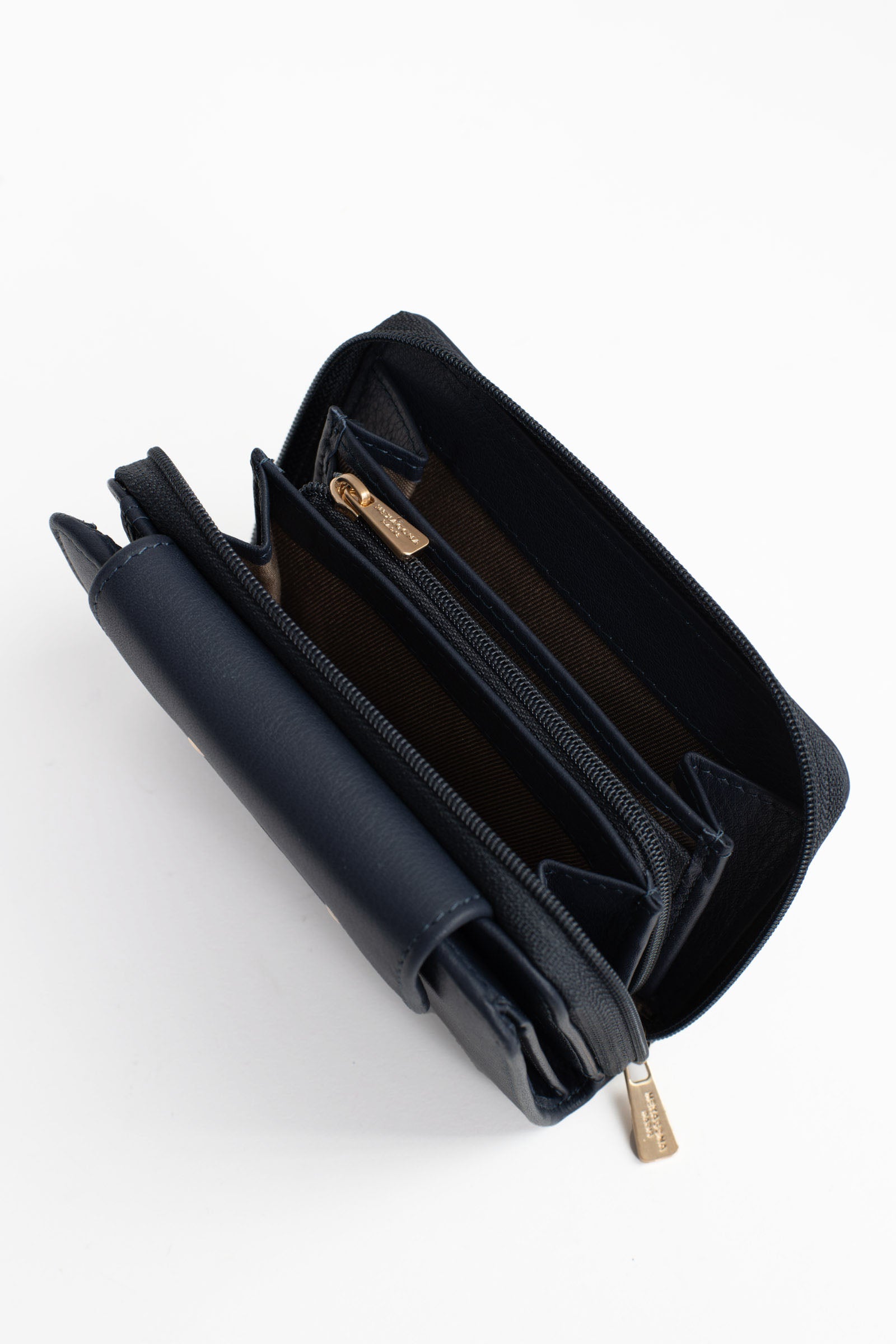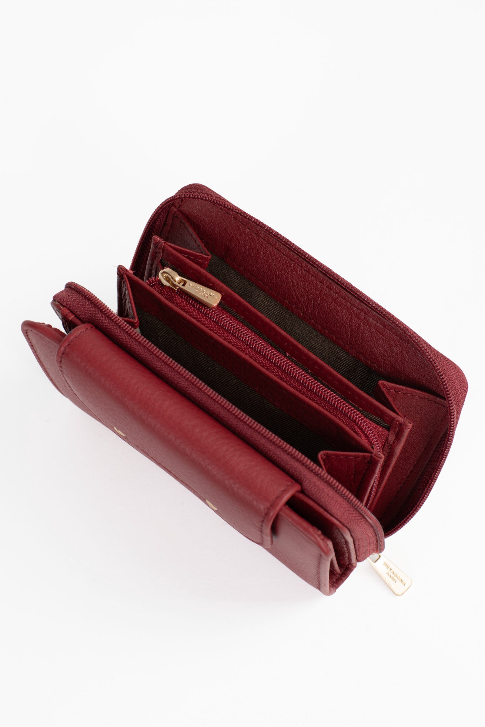 - Intérieur : 2 volets. 1 compartiment principal. 1 porte-monnaie zippé. 6 poches plates (dont 2 à vue transparente). 6 emplacements carte. 1 poche billets.