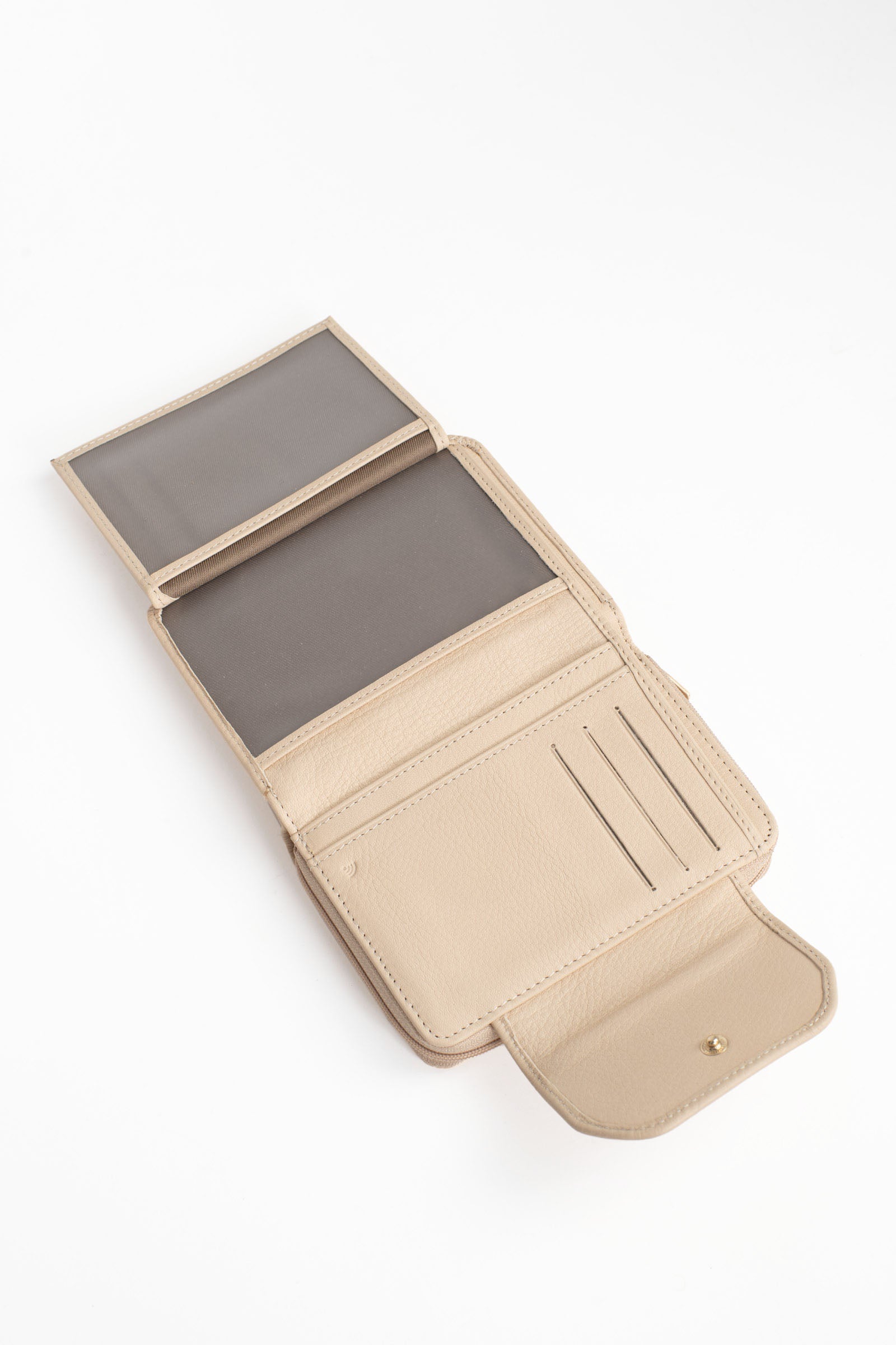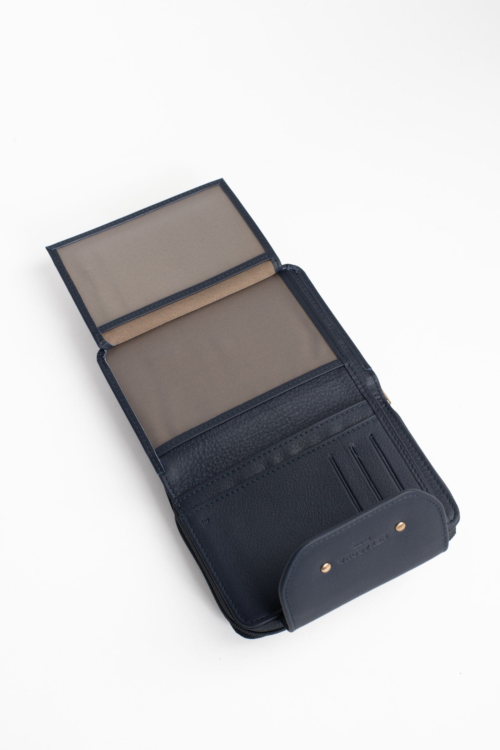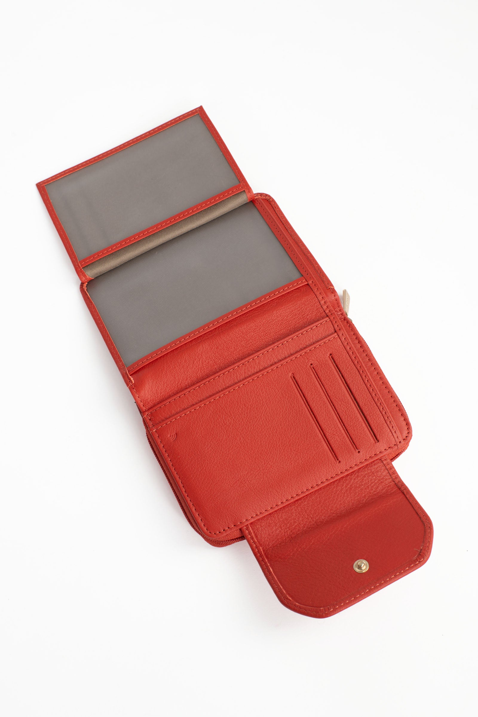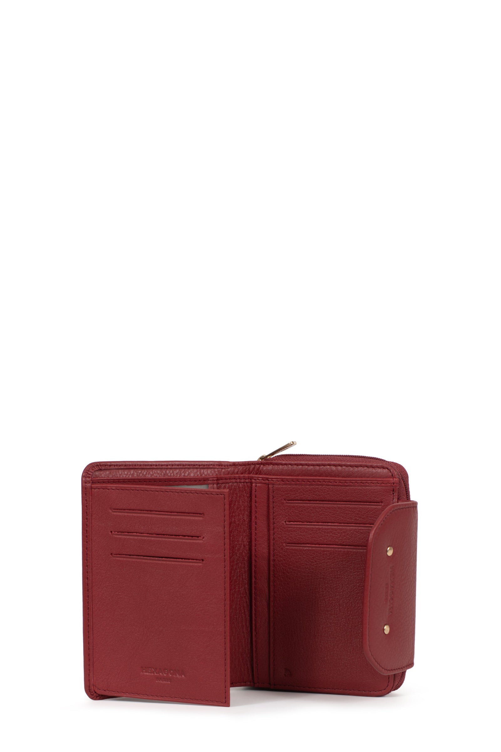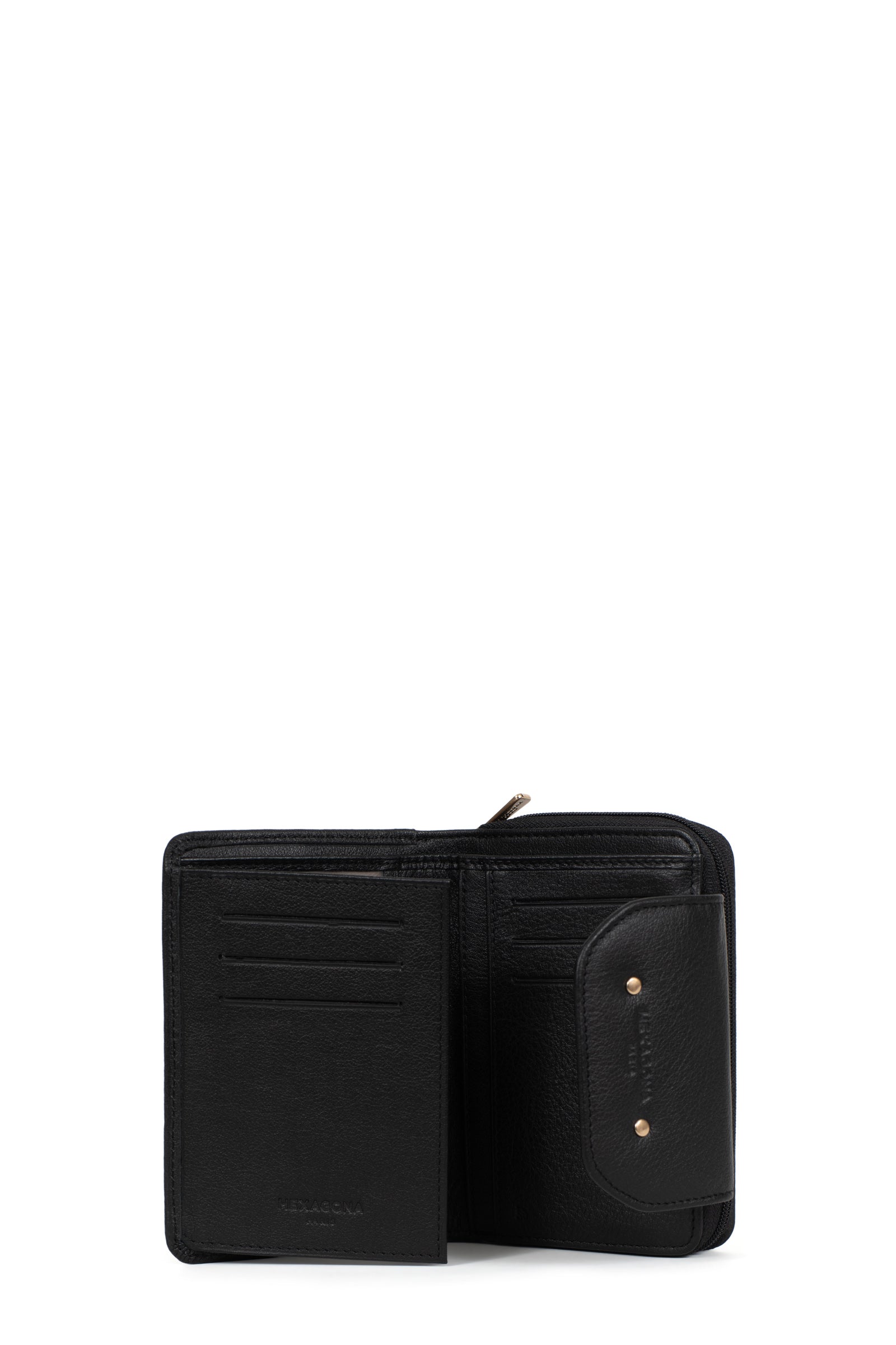 - Intérieur : 2 volets. 1 compartiment principal. 1 porte-monnaie zippé. 6 poches plates (dont 2 à vue transparente). 6 emplacements carte. 1 poche billets.