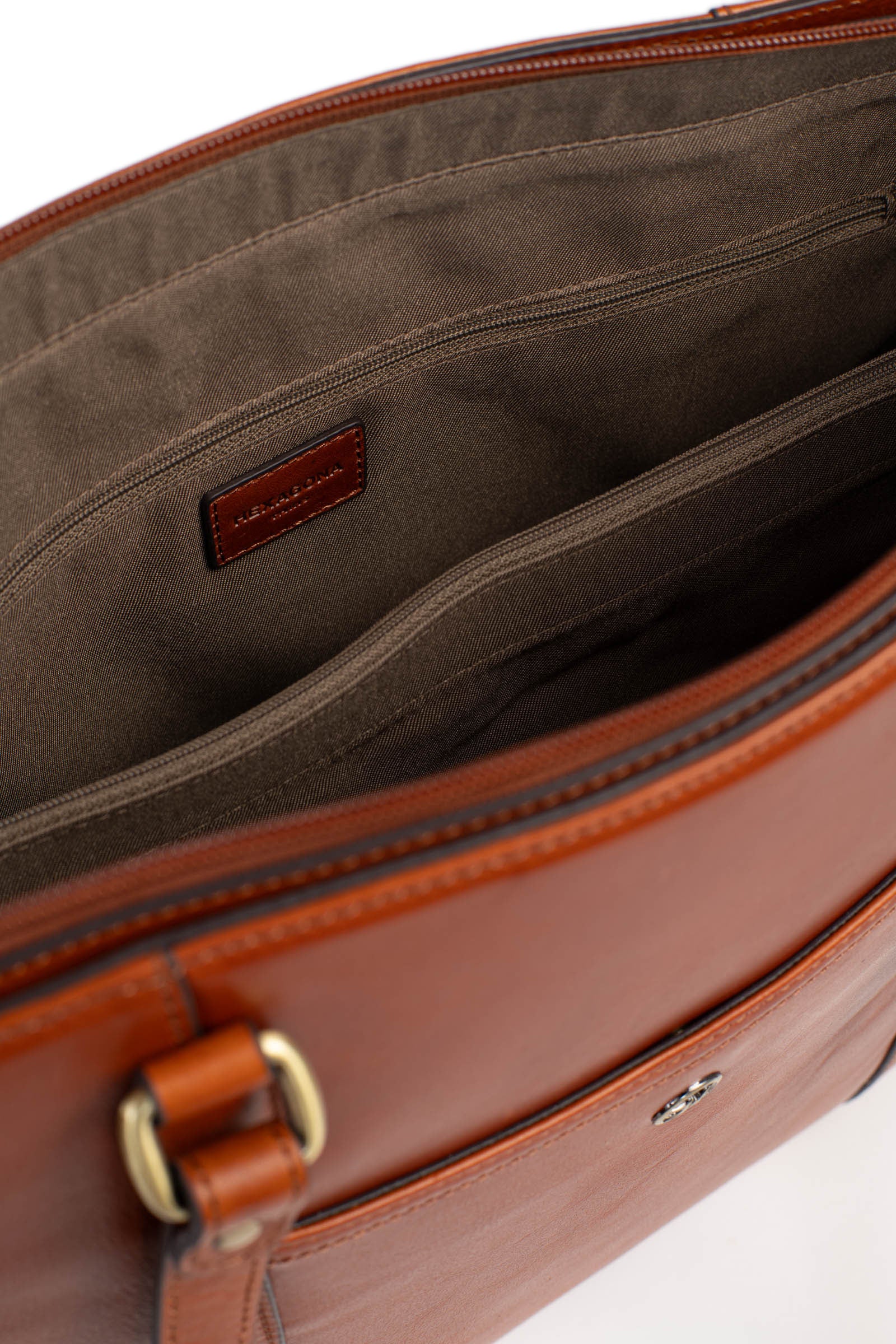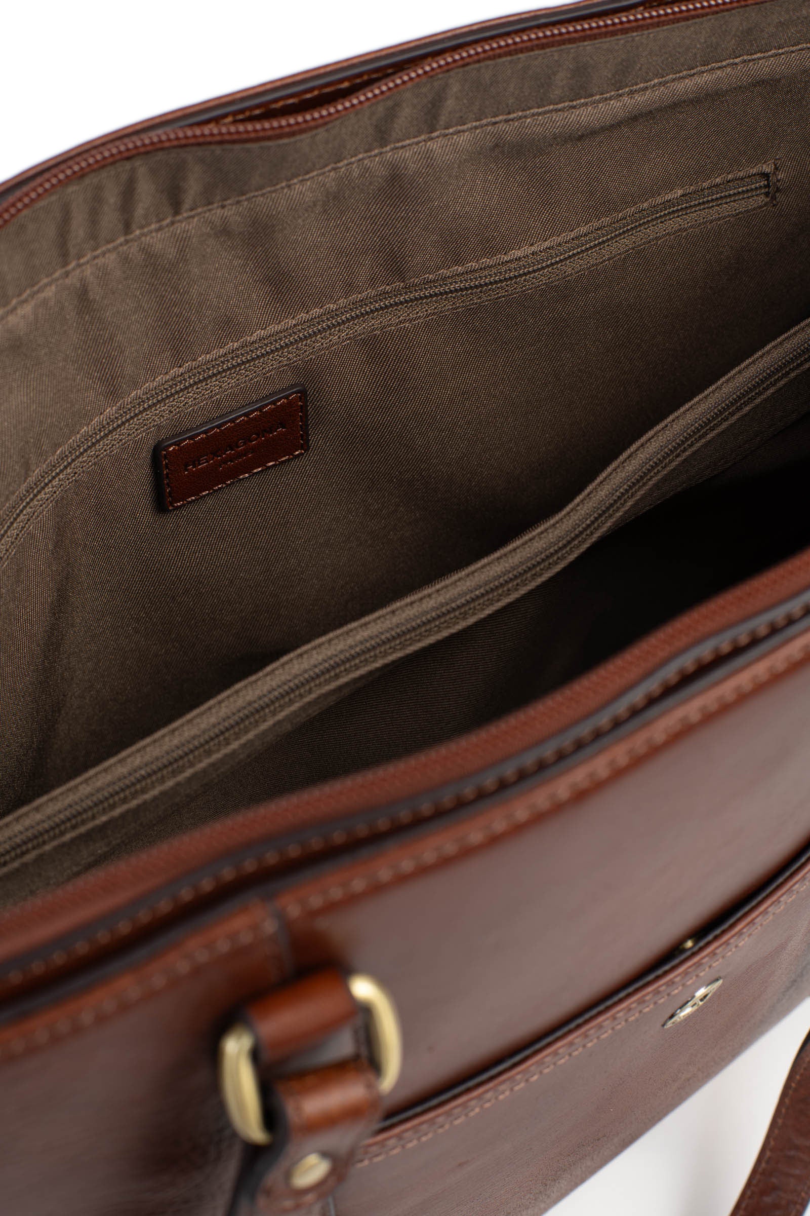 Le cuir de haute qualité offre une texture douce et résistante, tandis que les finitions en métal bronze brossé ajoutent une touche de sophistication. Disponible en plusieurs teintes, notamment noir, marron foncé et cognac, ce sac s'adapte à toutes les préférences de style.
