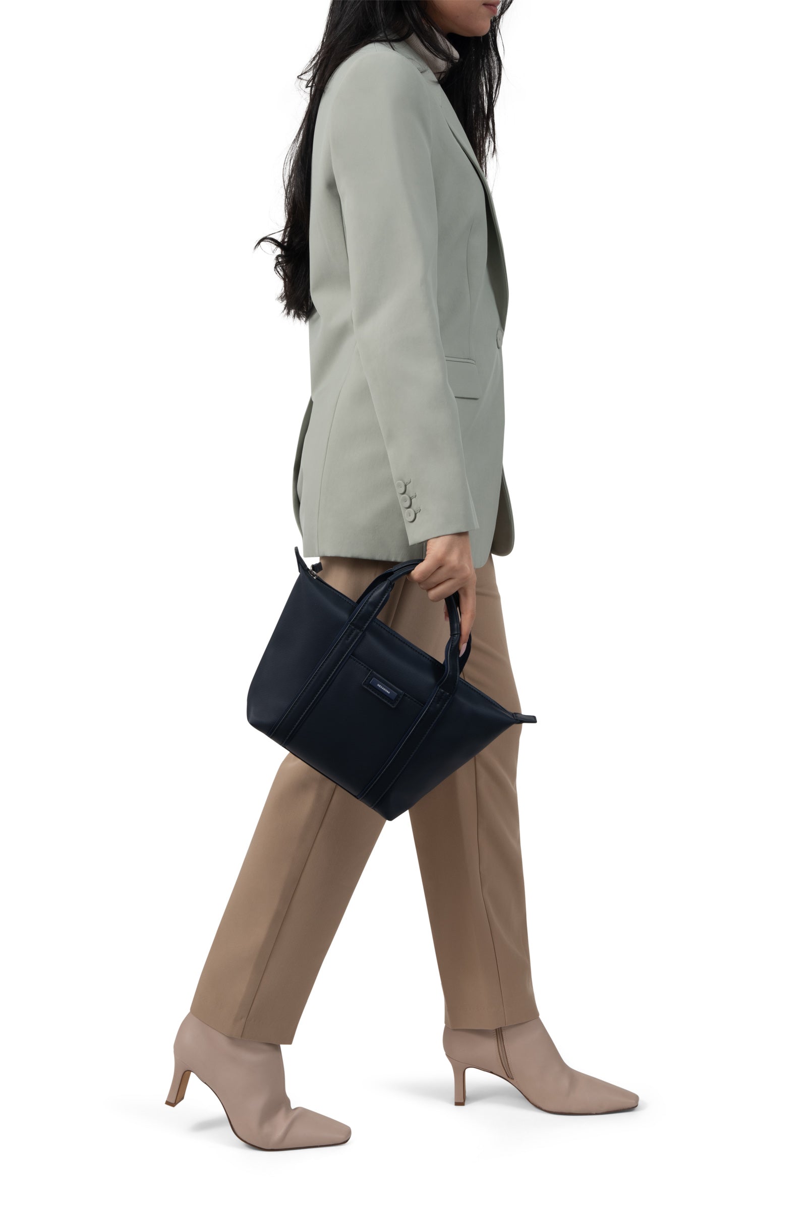 2 poignées non réglables non amovibles avec surpiqûres en T (30 cm). 1 bandoulière supplémentaire réglable amovible (67 cm mini/125 cm maxi).